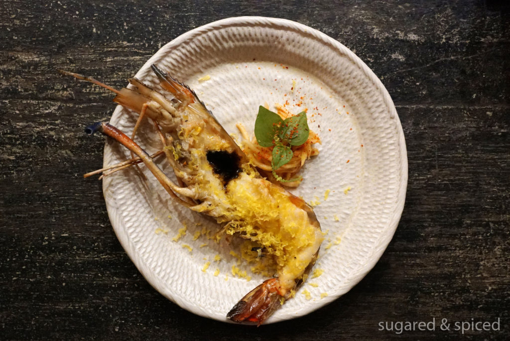 Butter Basted River Prawn, Green Mango Pickle, Grated Egg.