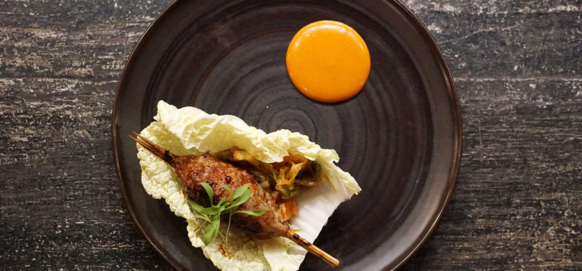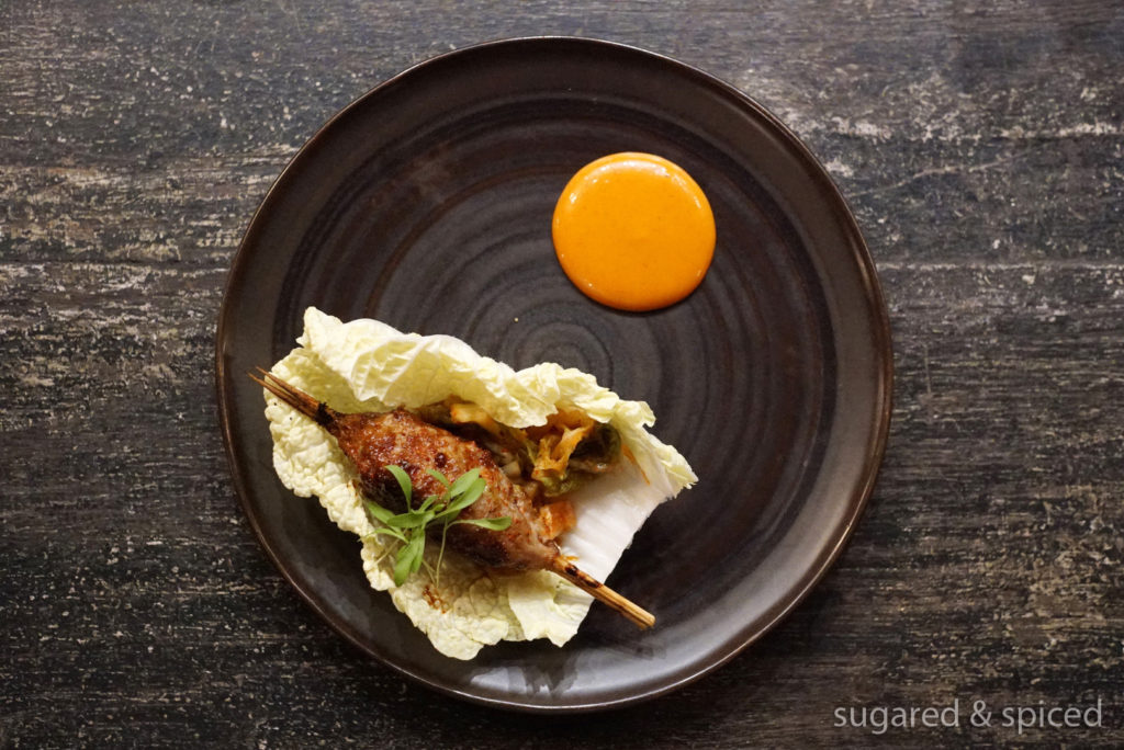 Duck Yakitori, Kimchee, Cabbage Wrap.