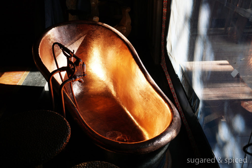 My favorite item in the bathroom, without a doubt, is this gorgeous copper freestanding bath. The hammered patterns apparently took 100 hours to complete!
