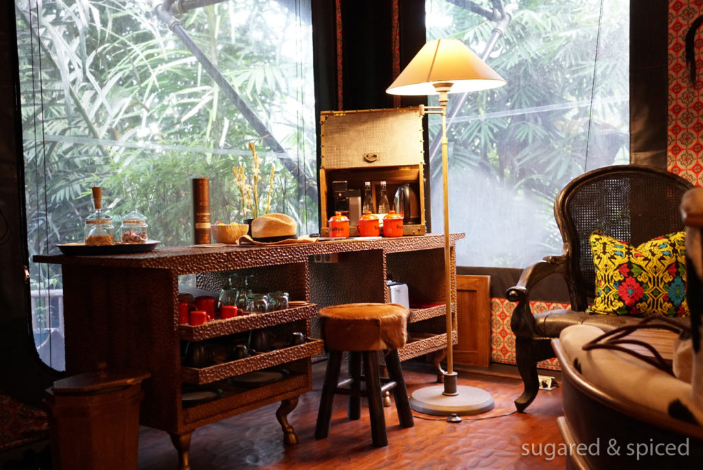 The tent’s modern amenities were more than sufficient – air conditioning, fans, safe, water kettle, coffee machine…and everything’s hidden so well! This generous drinks cabinet, for example, looked like an ordinary belted trunk before we popped it open.