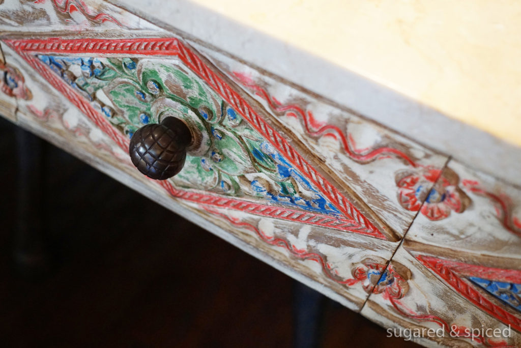 The bathroom is also full of pleasant surprises, like the asymmetry of the double wash basins, and the intricate wood carvings of the drawers.