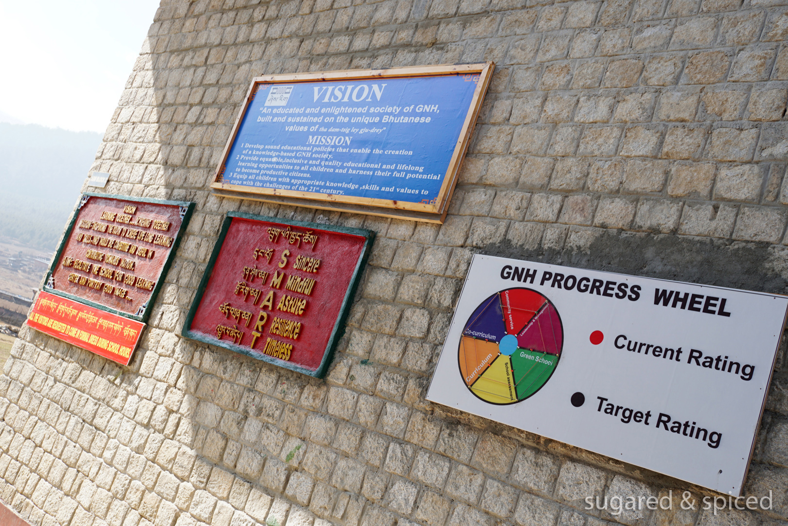 Upon entering the school, I noticed references to “Gross National Happiness” (GNH) on the walls. The fourth king of Bhutan coined the term in the 1970s (when he was only in his early 20s!), by explaining that he would rather have GNH for his people than GDP. Bhutan has foregone opportunities to make money off its considerable natural resources – lumber, water, minerals, animals…often eschewing economic growth in favor of environmental preservation, good governance, culture and tradition, which are believed to be more important to the well-being of its people.