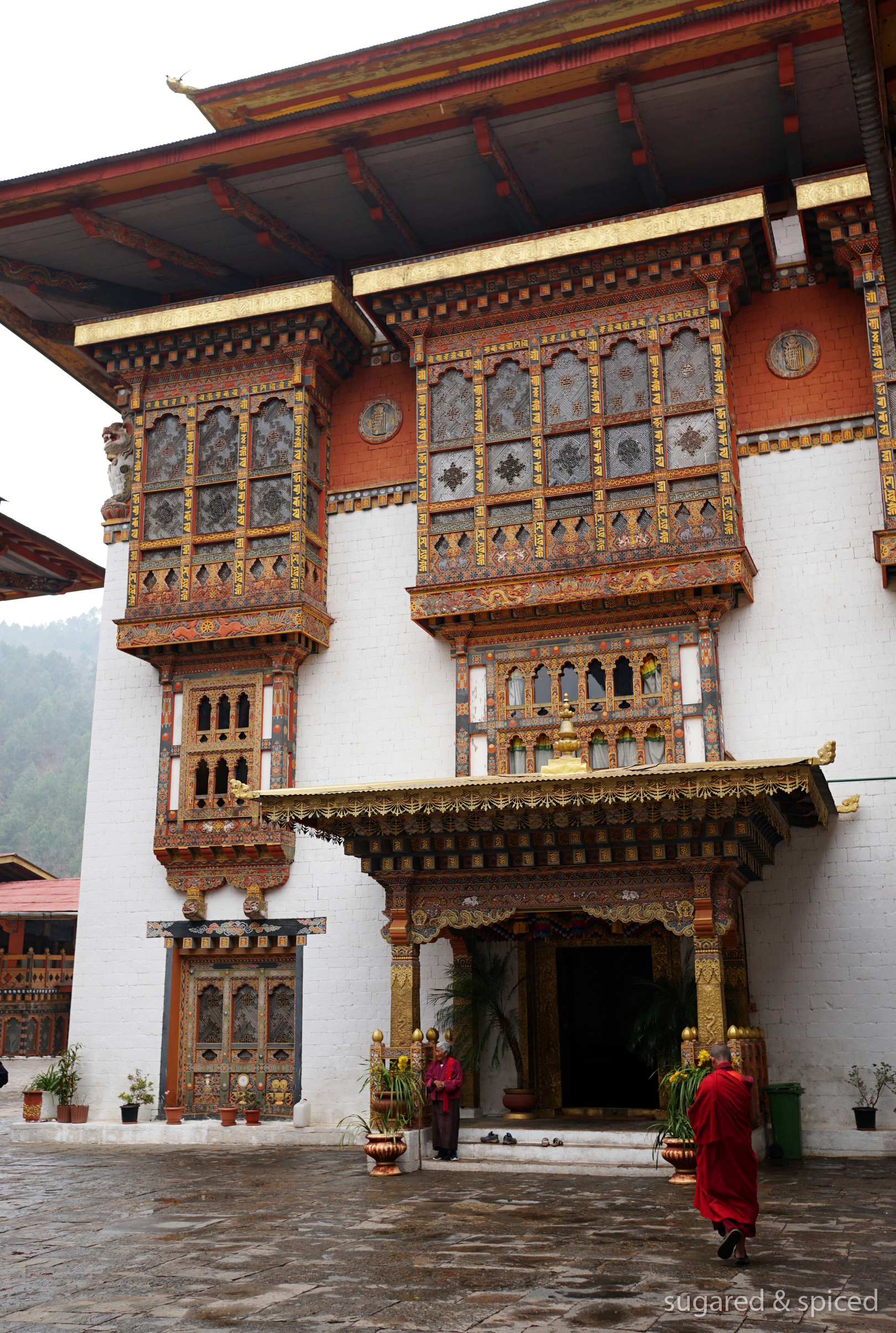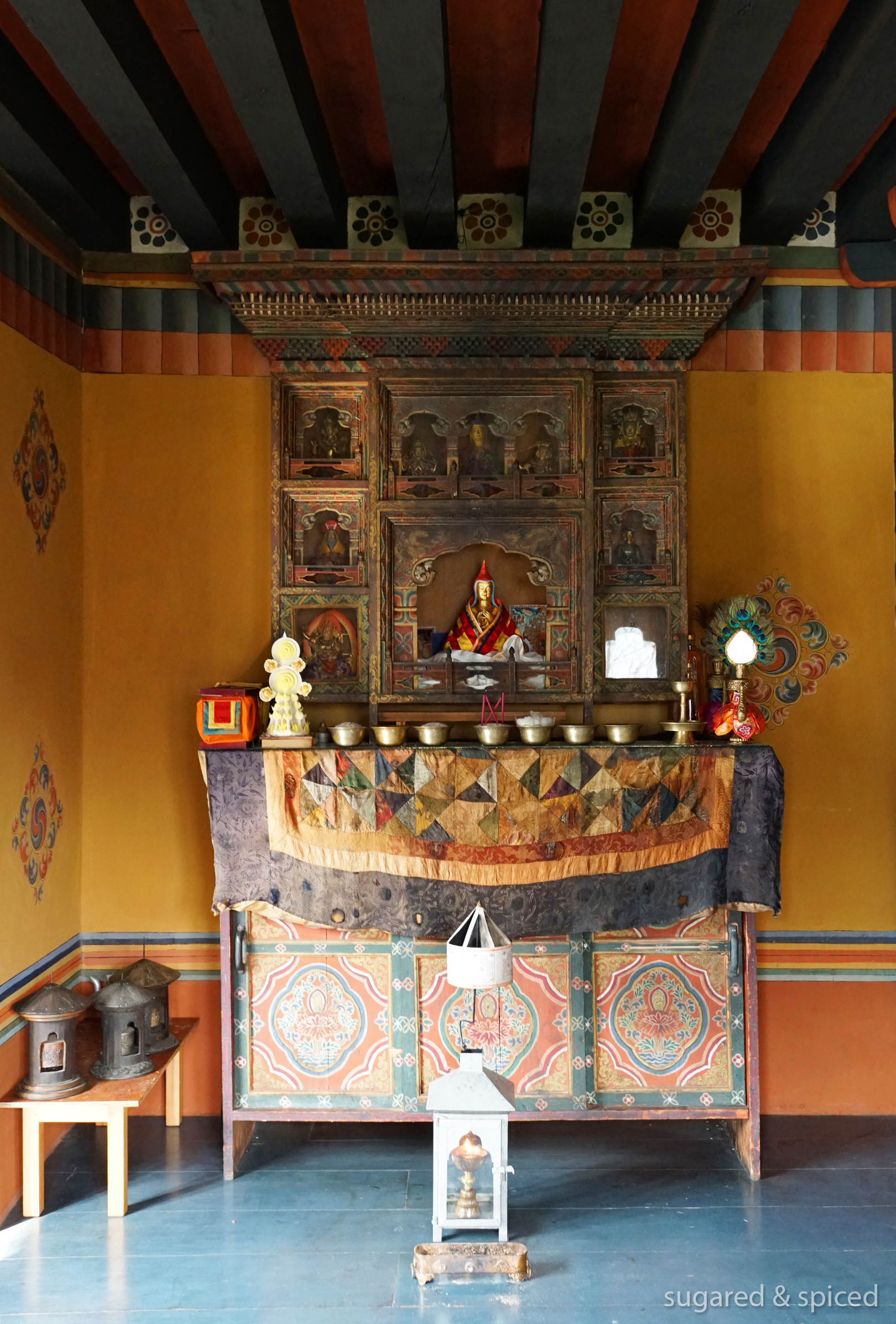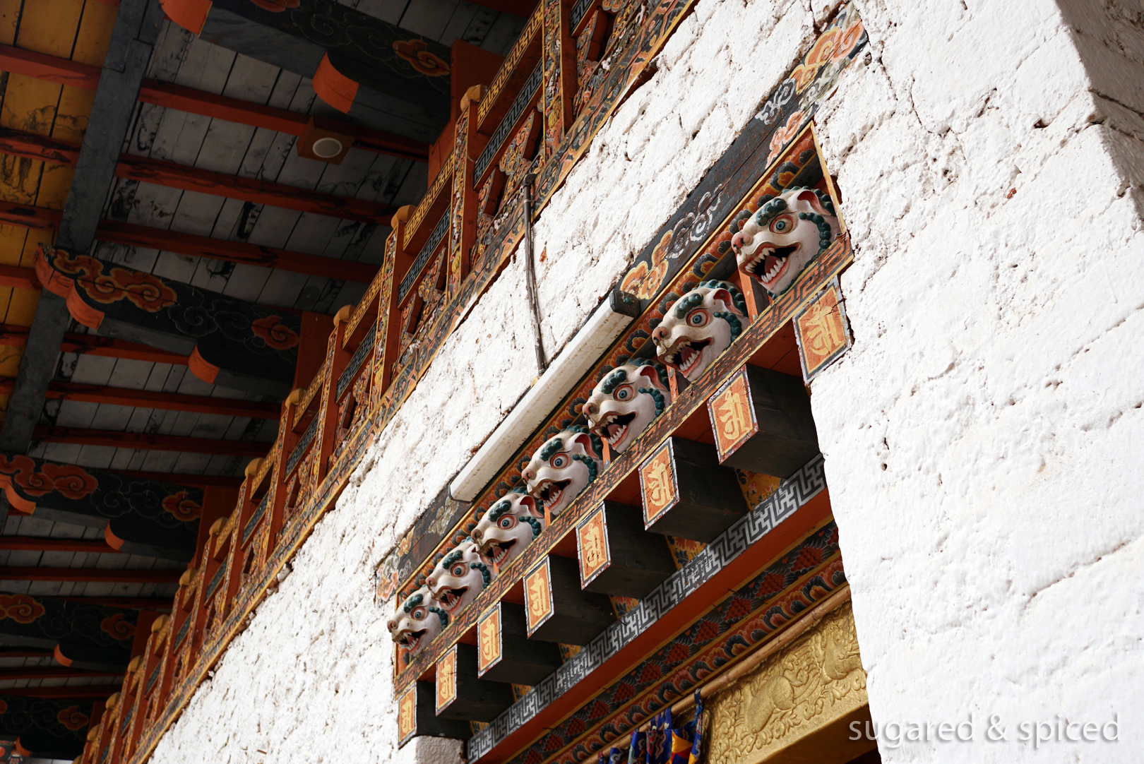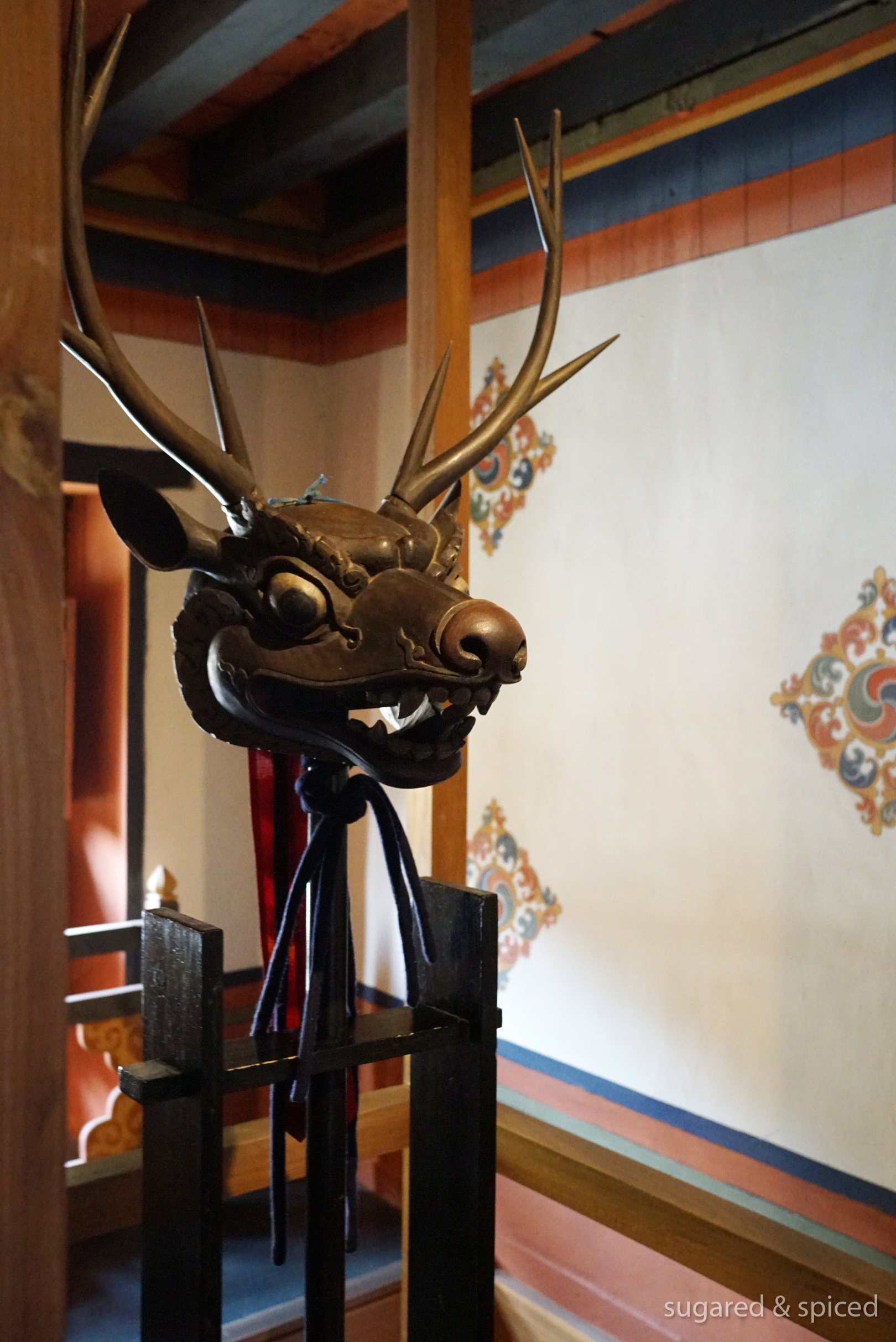 After thoroughly admiring the exquisite exteriors, we headed into the kunrey, the hundred-pillar assembly hall (which actually has only 54 pillars). Covering the walls of the hall are exceptional murals depicting the life of Buddha, from his birth as Prince Siddhartha Guatama to his eventual enlightenment under a bodhi tree. There are also three monumental golden statues of the Buddha, Guru Rinpoche and Zhabdrung (known colloquially as the Bearded Lama, he was a Tibetan lama who unified Bhutan as a nation-state) dating back to the mid-18th century.