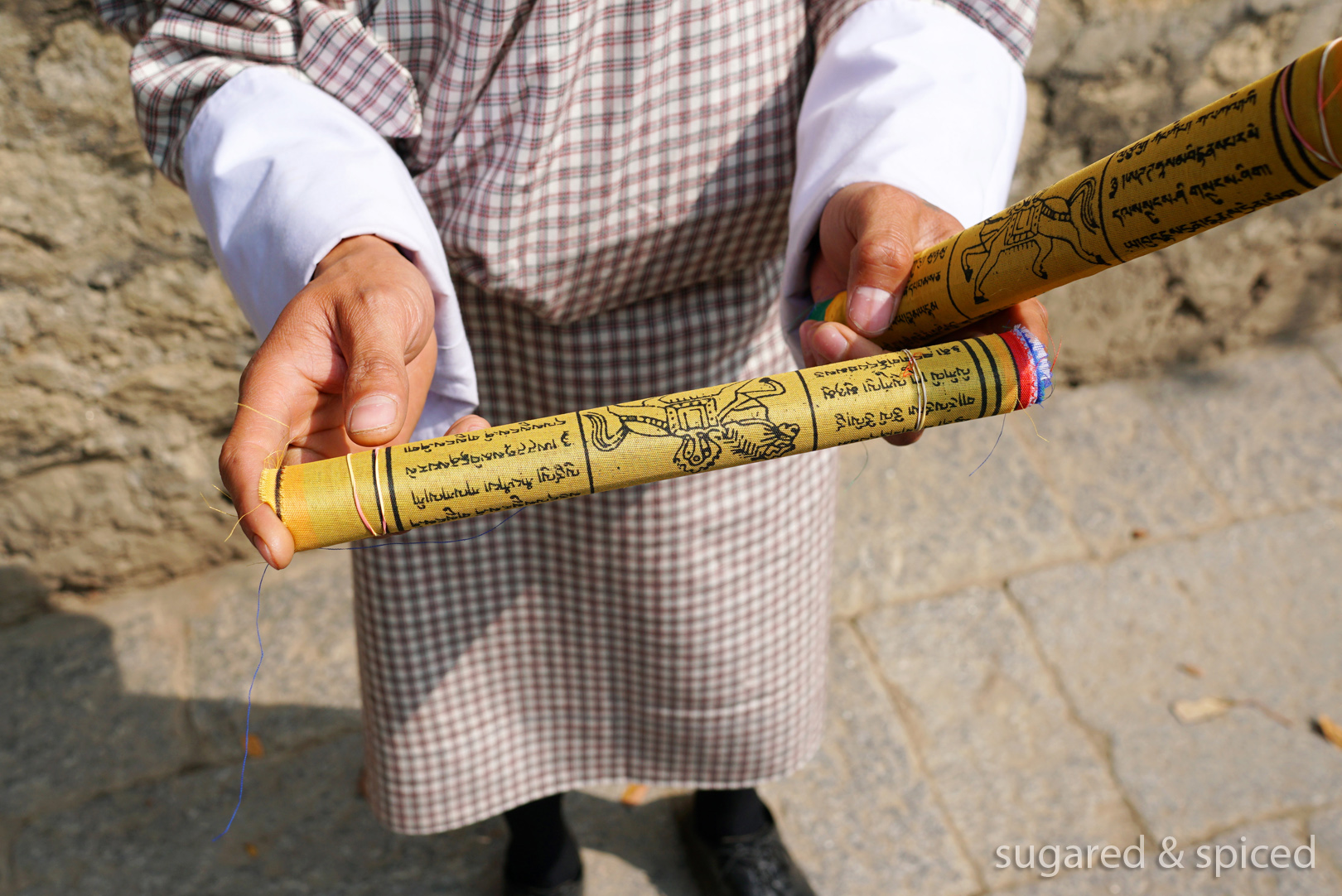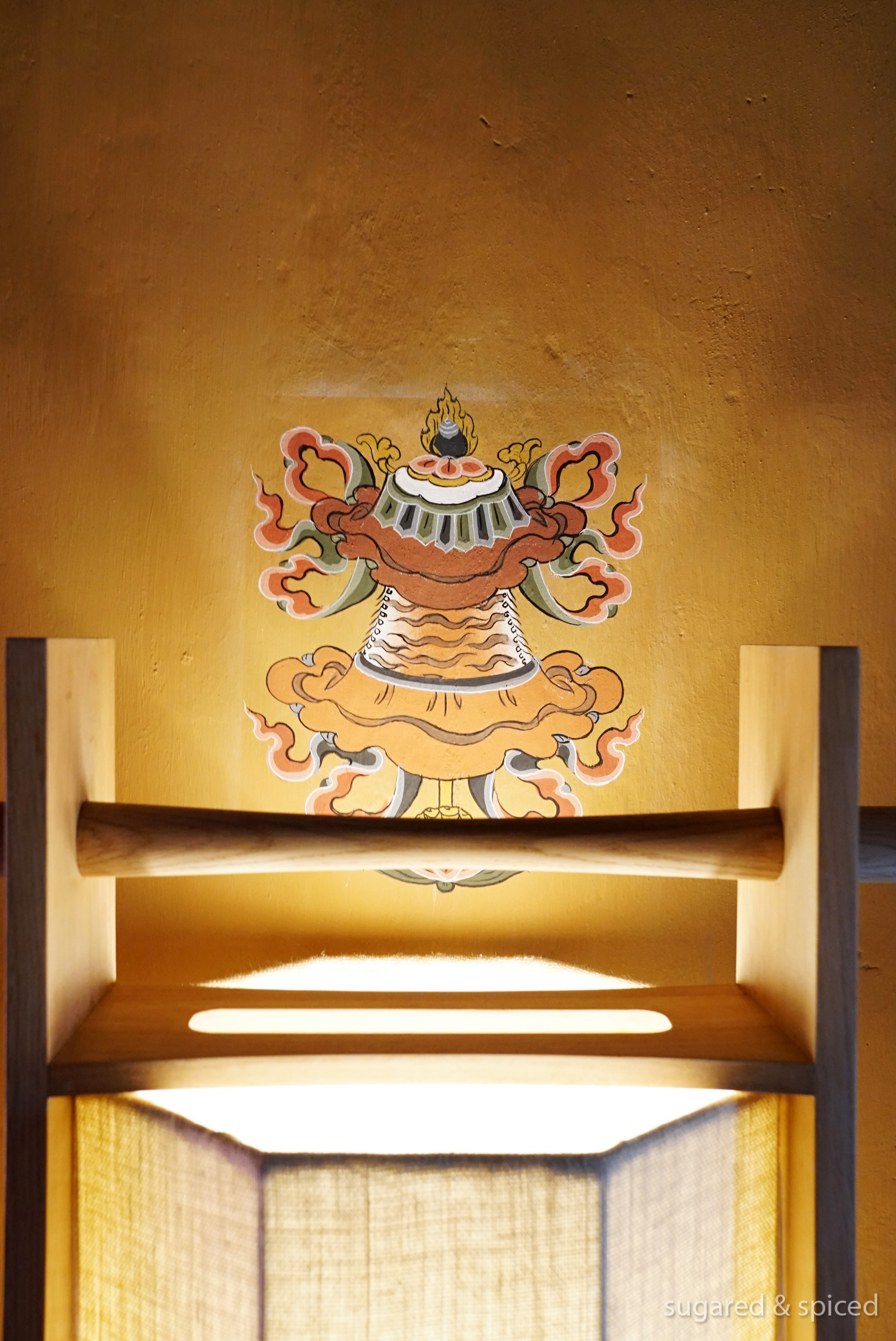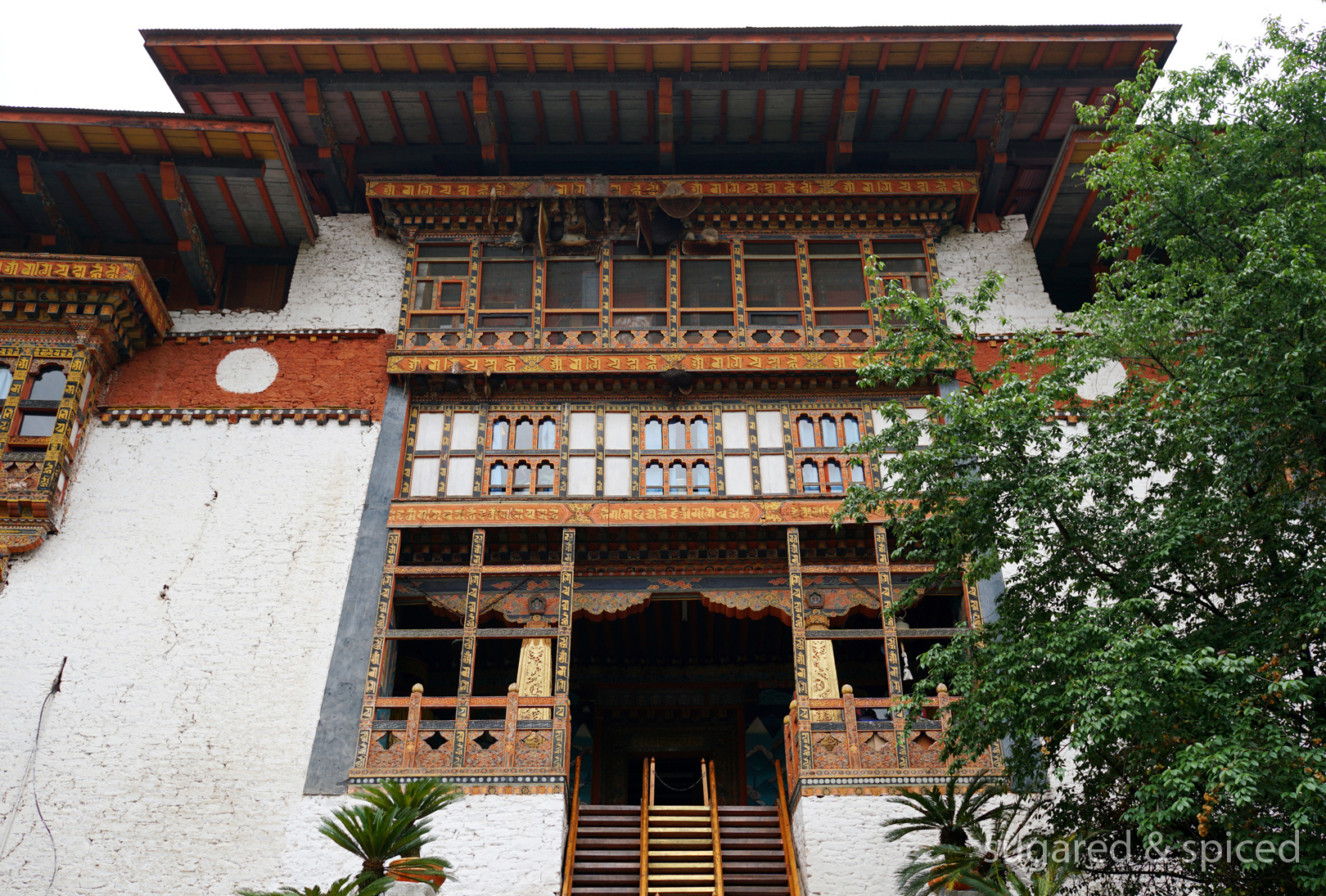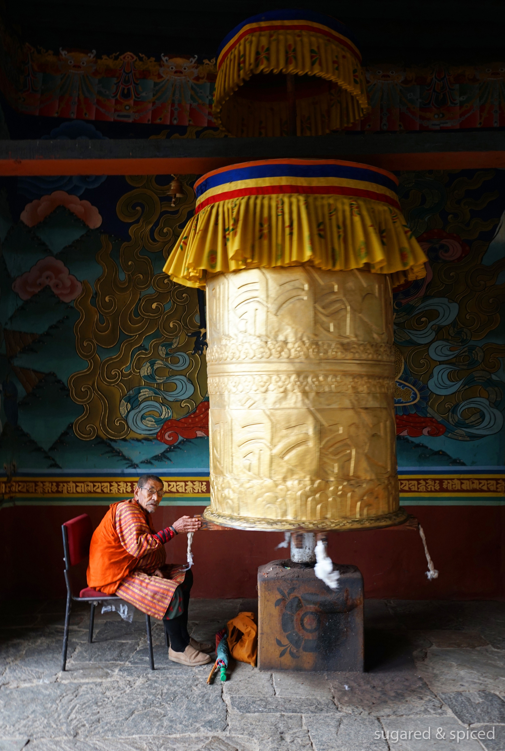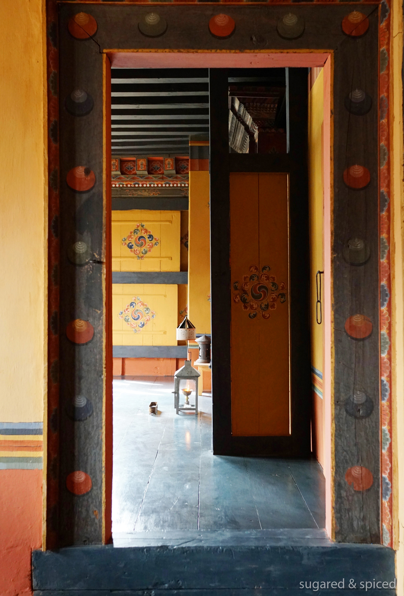 After thoroughly admiring the exquisite exteriors, we headed into the kunrey, the hundred-pillar assembly hall (which actually has only 54 pillars). Covering the walls of the hall are exceptional murals depicting the life of Buddha, from his birth as Prince Siddhartha Guatama to his eventual enlightenment under a bodhi tree. There are also three monumental golden statues of the Buddha, Guru Rinpoche and Zhabdrung (known colloquially as the Bearded Lama, he was a Tibetan lama who unified Bhutan as a nation-state) dating back to the mid-18th century.
