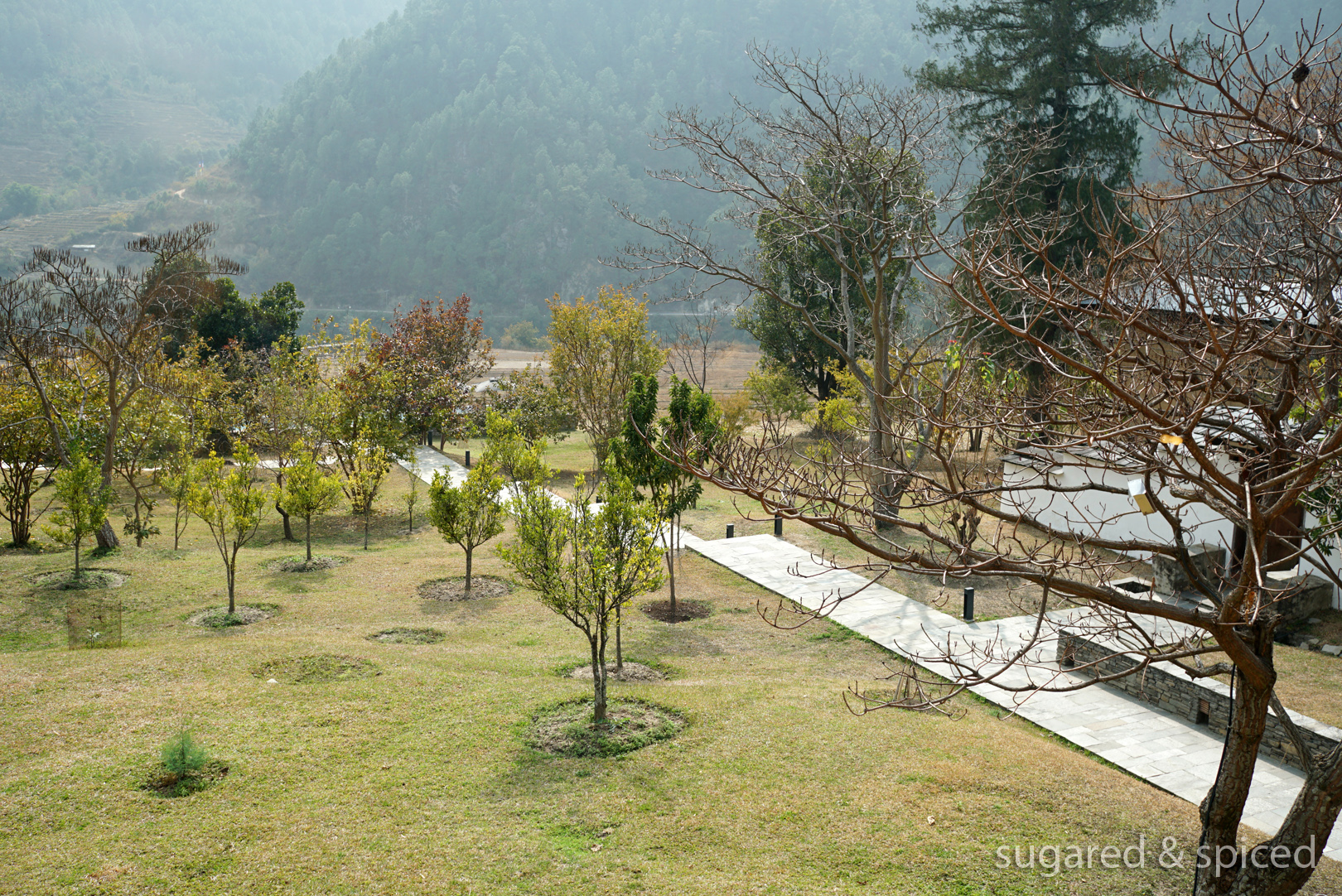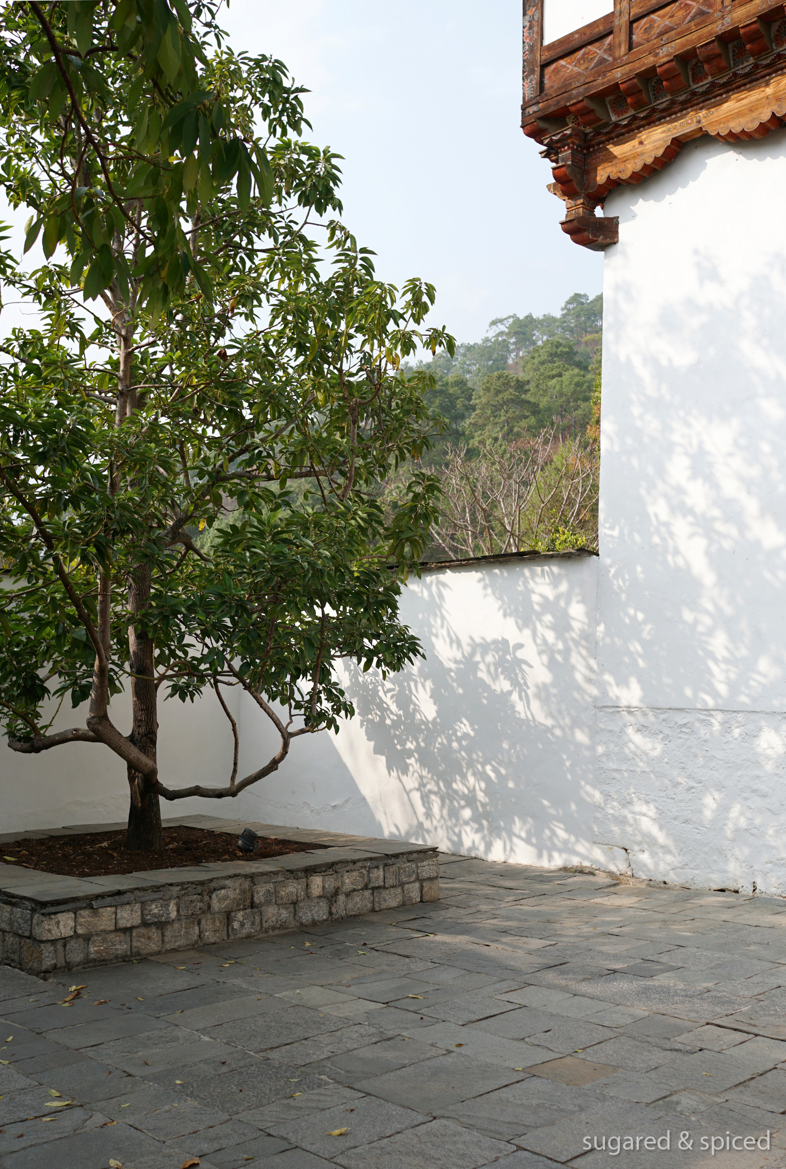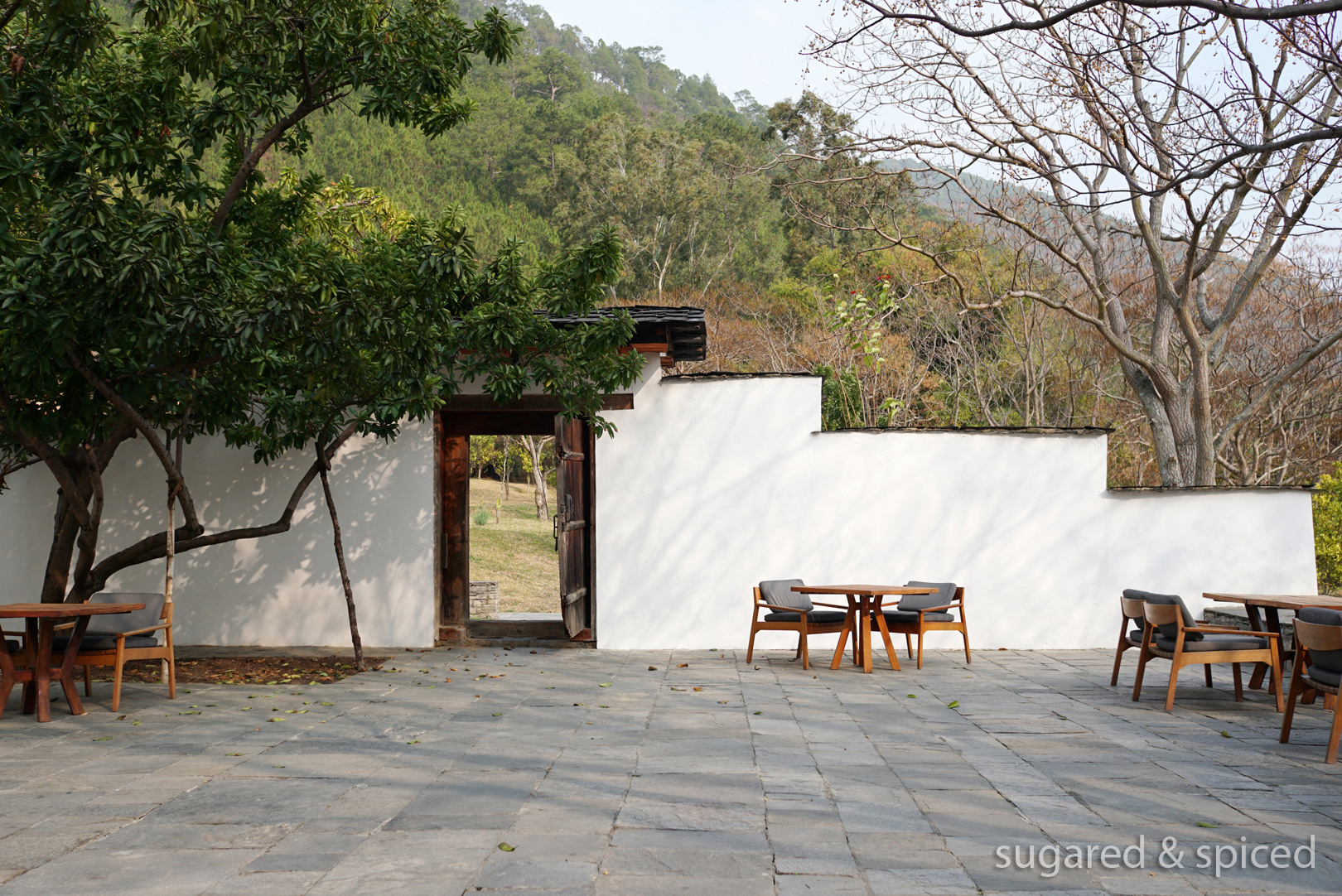 坐上接駁車穿過一片樹林,進入 Amankora Punakha。小巧精緻的庭院裡種著橘子樹和印度木棉,與之前在 Gangtey 被挺拔松樹環繞的氛圍完全不同,少了蒼勁飄渺,多了雕琢雅緻。