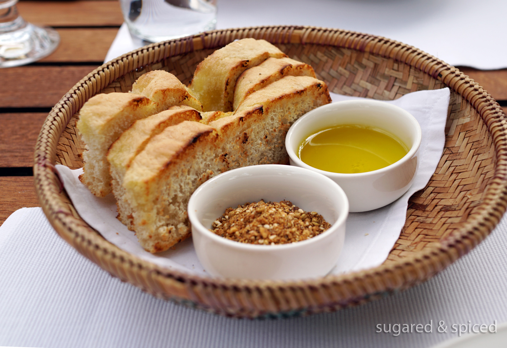 義大利香草麵包佐榛果香料蘸醬和橄欖油。