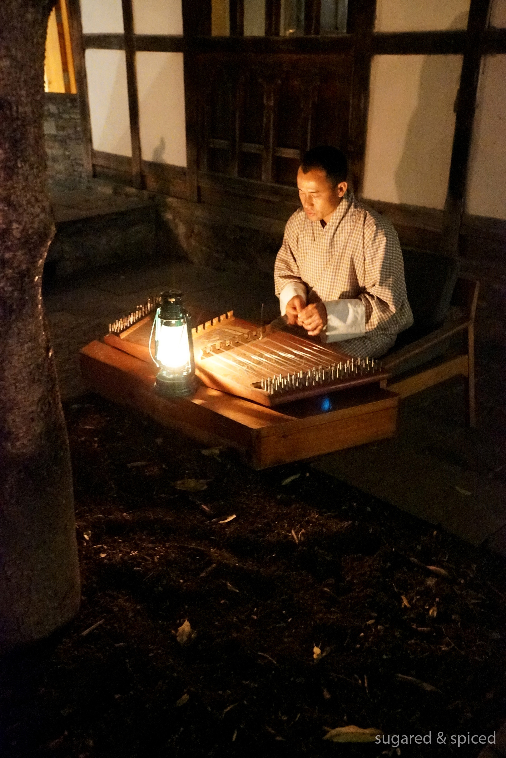 入夜後,庭院裡點起了溫暖的篝火。雖然還不餓,但仍在這裡坐了一會兒,喝杯熱茶,享受樂手現場演奏的琵琶和揚琴。揚琴的音色時而如叮咚山泉,時而似大珠小珠落玉盘,和上不丹歌謠,讓人聽得入迷。