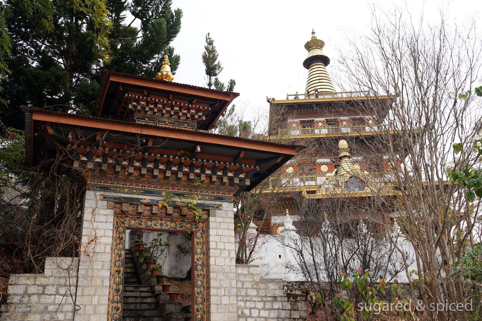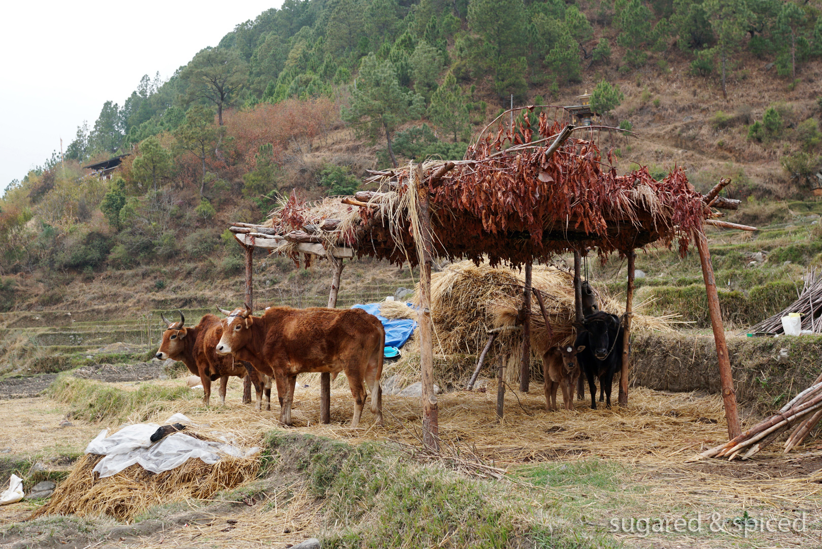 After lunch back at the lodge, it was time to hike to Khamsum Yulley Namgyal Chorten. We followed a narrow track along a little creek and through rice paddies, chili pepper farms, grazing ponies, cow sheds…