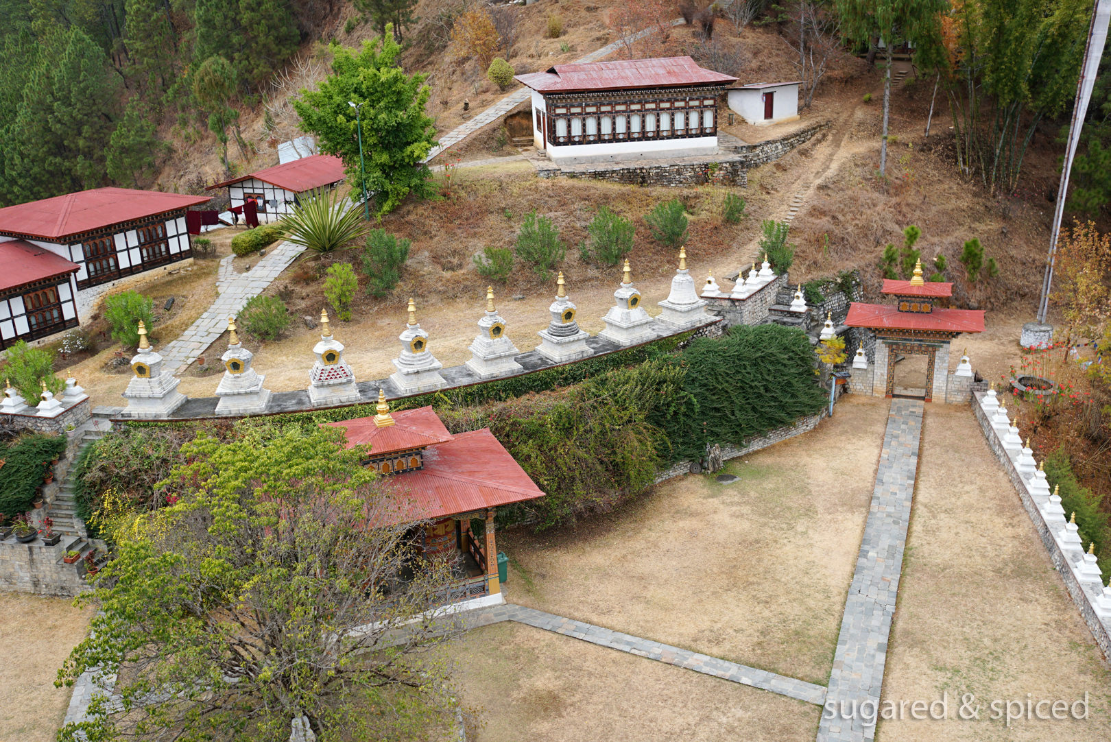 The ambience was peaceful. A few local villagers were having a small picnic inside a well-tended garden with a lovely bodhi tree, two large prayer wheels stand quietly under shelter, and 108 mini chortens surround the entire Khamsum Yulley Namgyal grounds.