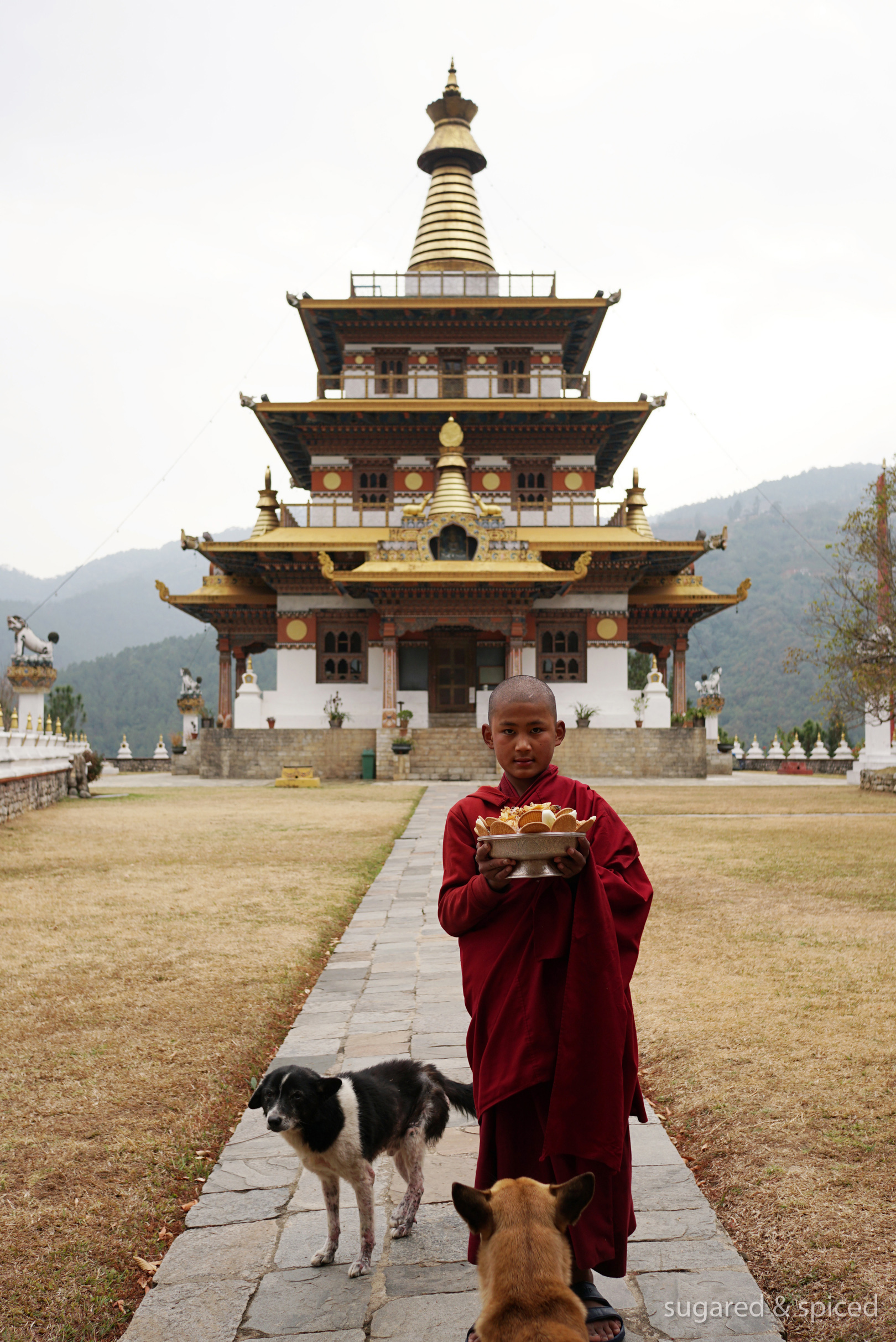 And finally, we arrived at Khamsum Yulley Namgyal Chorten. This four-story, pagoda-style chorten was built by one of the Queen Mothers with the purpose of warding off evil spirits, and bringing peace and harmony to all living things. There had been a ceremony at the temple earlier during the day, and this young monk came over to share the blessed offerings with us. Seeing that we only took a piece of melon, he insisted on us taking more, stuffing a second piece of fruit in our hands.