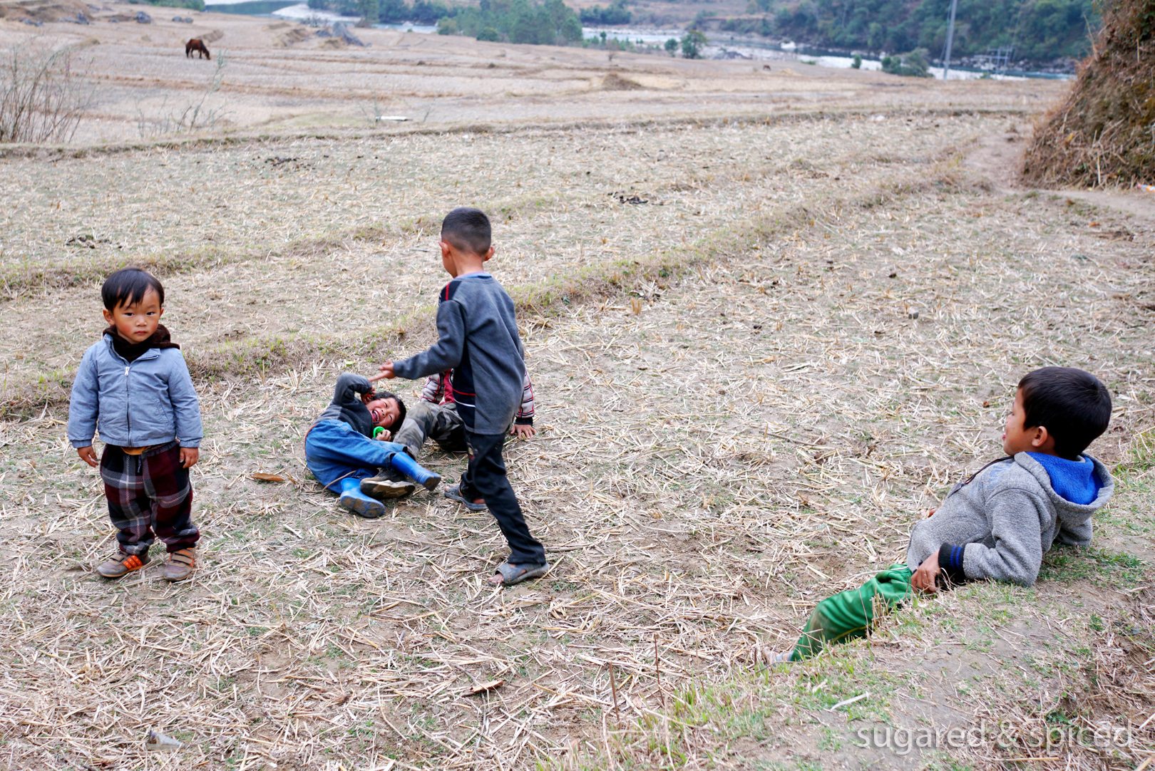 Kids, proudly showcasing their skills of cartwheeling down the terrace fields.