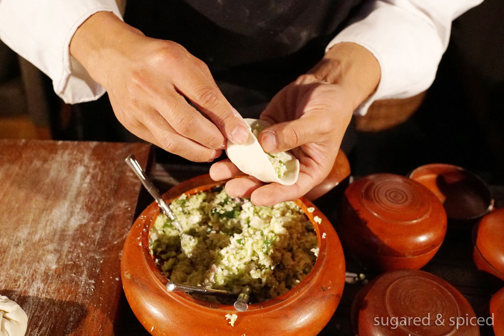 Chef 先示範如何做 momo 蒸餃。雖然我們對餃子並不陌生,但不丹餃子的內餡和包法都和我們所知道的稍有不同。這天做的是素餃,包的內餡是捲心菜、紅洋蔥、薑、和當地起司。