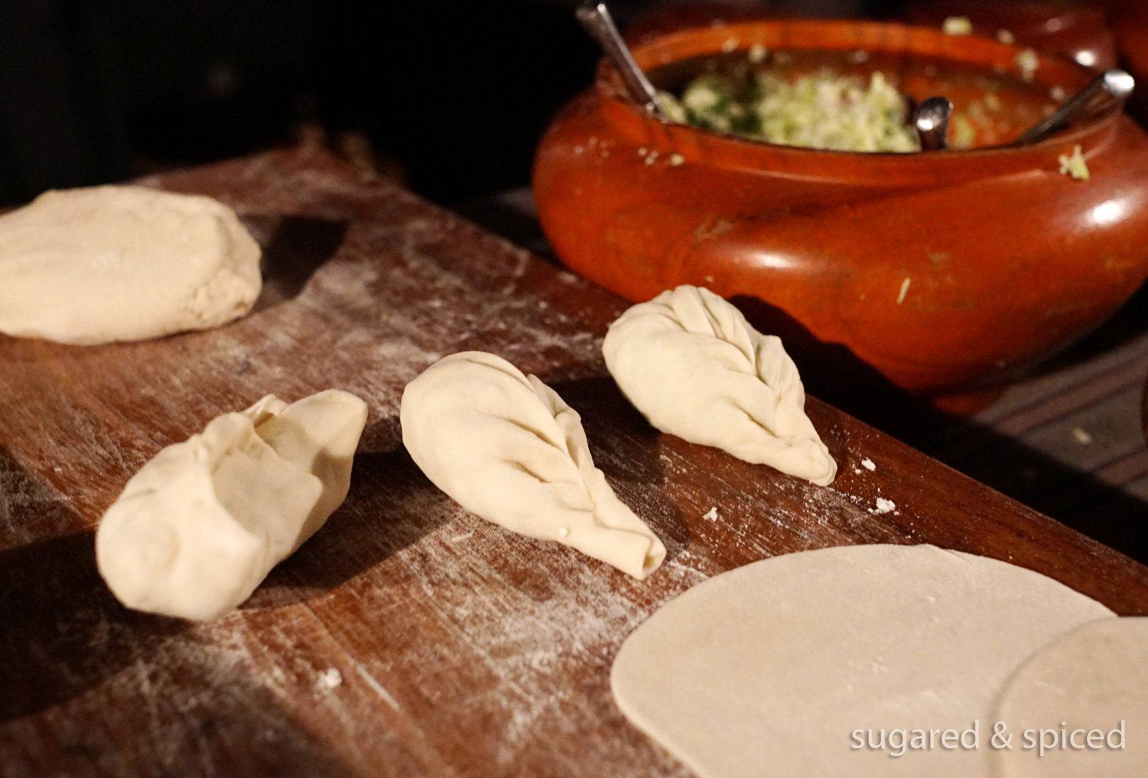 We started by learning how to make the “momo”, Bhutanese steamed dumplings. Being Taiwanese, we are of course very familiar with dumplings, but it was interesting to see variations on the filling and the method of wrapping. After thoroughly mixing a filling of chopped cabbage, red onion, ginger, and local cheese, we folded it into round dumping wrappers, which were made simply with flour and water.