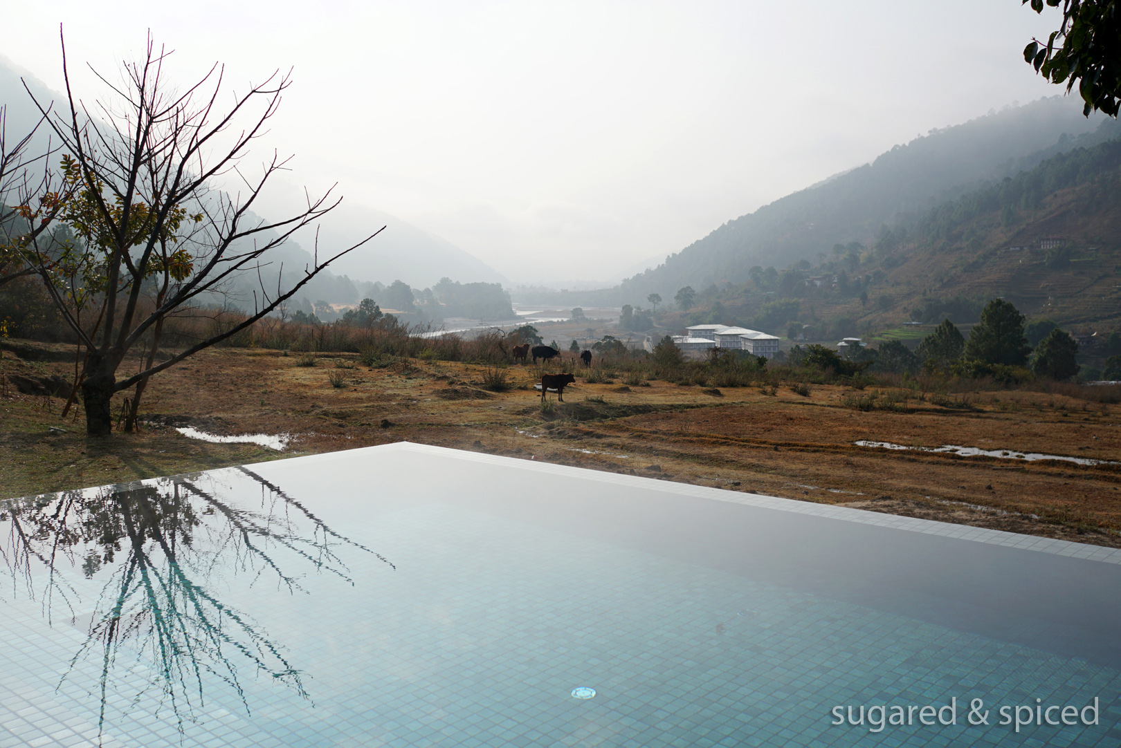 Punakha lodge 是五間 Amankora 裡唯一有泳池的,雖然因為天氣還微涼,我們沒有下水,不過可以想像春暖花開時泡在泳池裡,遠處有朦朧山谷,近處有牛兒靜靜吃草,應該相當愜意。