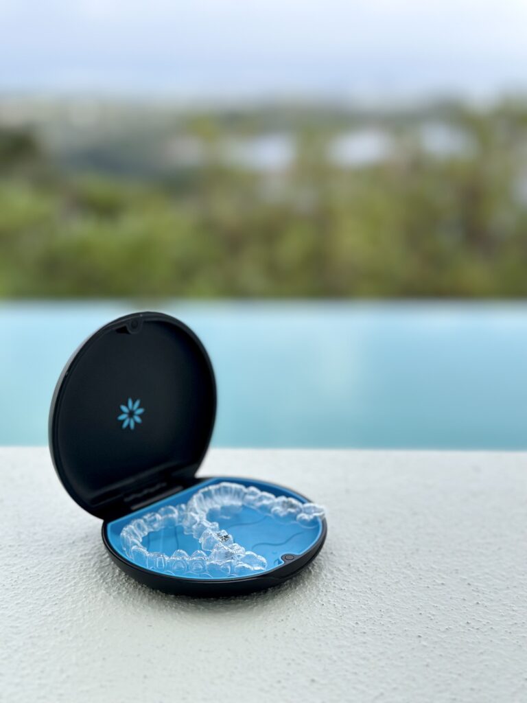 另外一個挑戰是旅行。開始戴隱適美的第二個月我就去了沖繩,旅途中的飲食不像日常生活那樣固定,也很難隨時找得到適合刷牙的地方,無法做到像在台北時那樣每餐飯後立刻刷牙戴上牙套。關於這一點,蘇醫師給的建議是:吃完東西後先簡單漱口,總之將隱適美戴上,到了下一個方便刷牙的地點再刷牙、清理牙套後重新戴上。