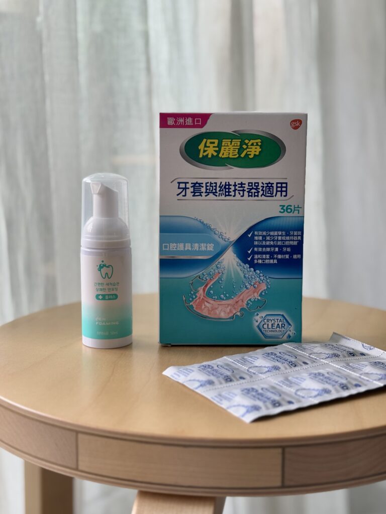 如何清理牙套呢?蘇醫師當時給了我一款她從韓國帶回來的泡沫狀牙套清潔產品,直接擠在牙套上後輕刷並沖水即可,非常方便。不過這個產品在台灣似乎買不到,所以用完後我另外購入了 “保麗淨口腔護具清潔錠”,覺得牙套不乾淨時,和清潔錠一次放入溫水中浸泡五分鐘後再沖刷乾淨,效果也不錯。