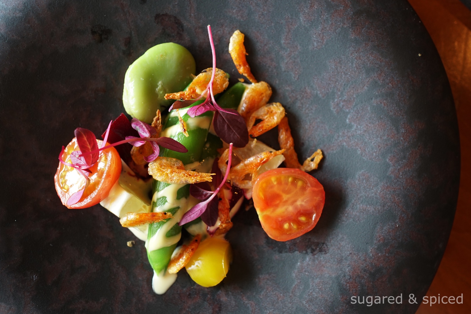 Snow peas, sakura shrimp, tomato, orange mayonnaise
