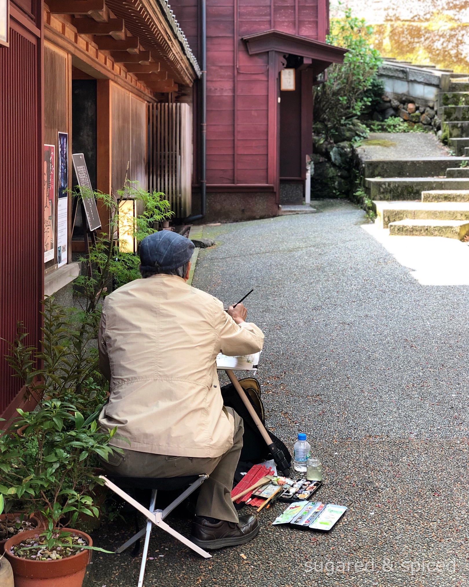 The stroll continued to Kanazawa’s historic “Kazuemachi”. An old man paints alone in the quiet alley, sunny and breezy.