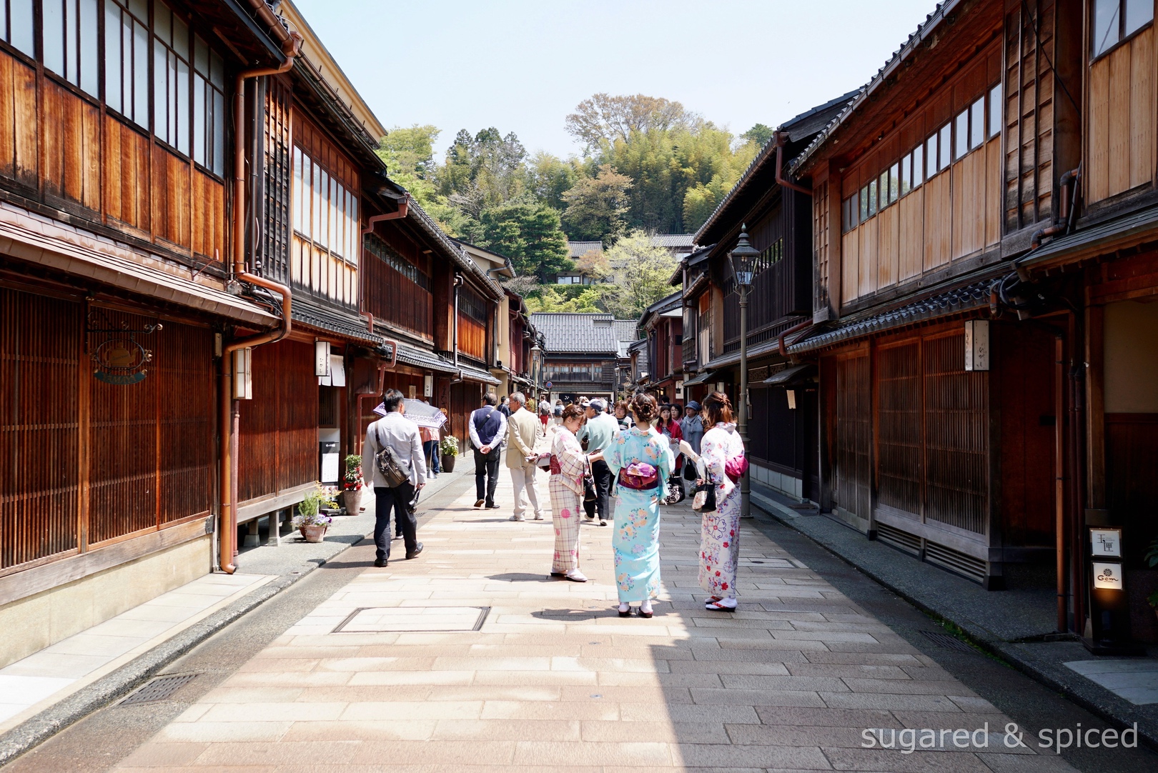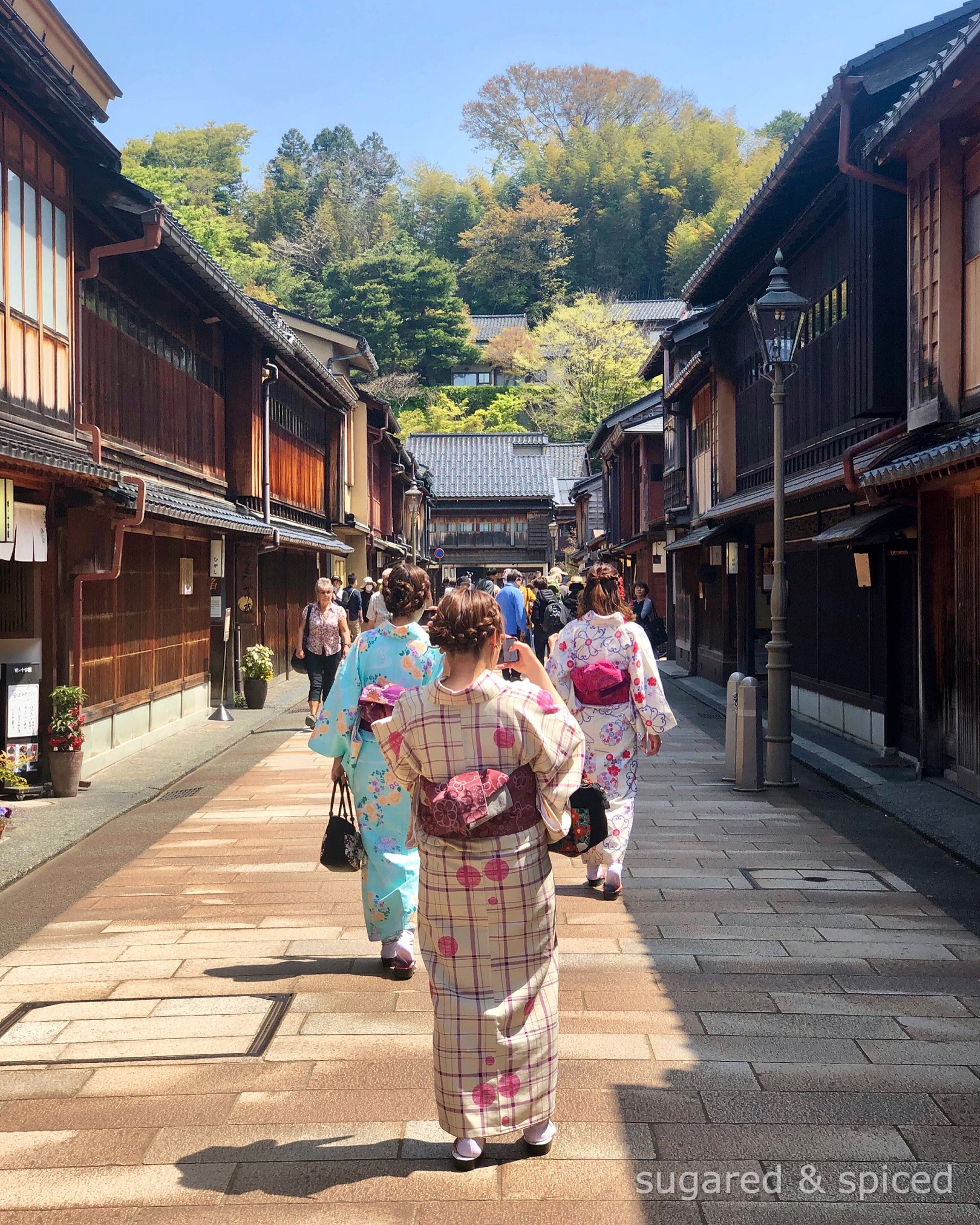 過了河來到 “東茶屋街”。茶屋指的是江戶時代欣賞藝妓表演的場所,而東茶屋街是現今少數還保有傳統茶屋建築、文化的街道之一,有 ”小京都“ 之美稱。幾個日本女孩穿著春色盎然的和服,襯著古老街道的景緻,頗有風味。