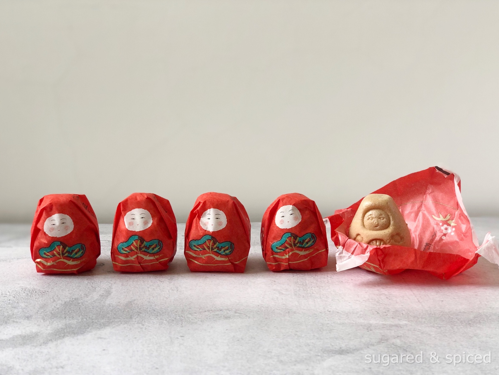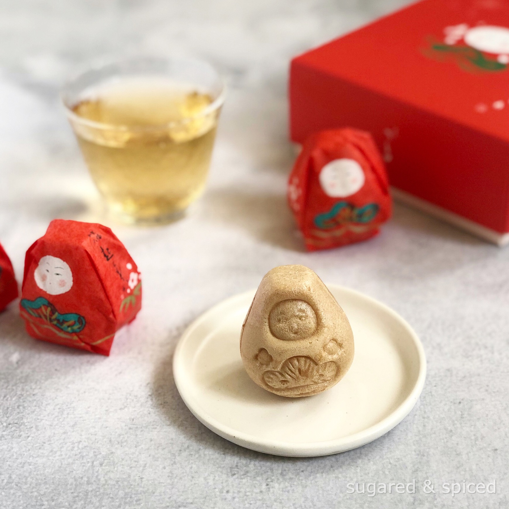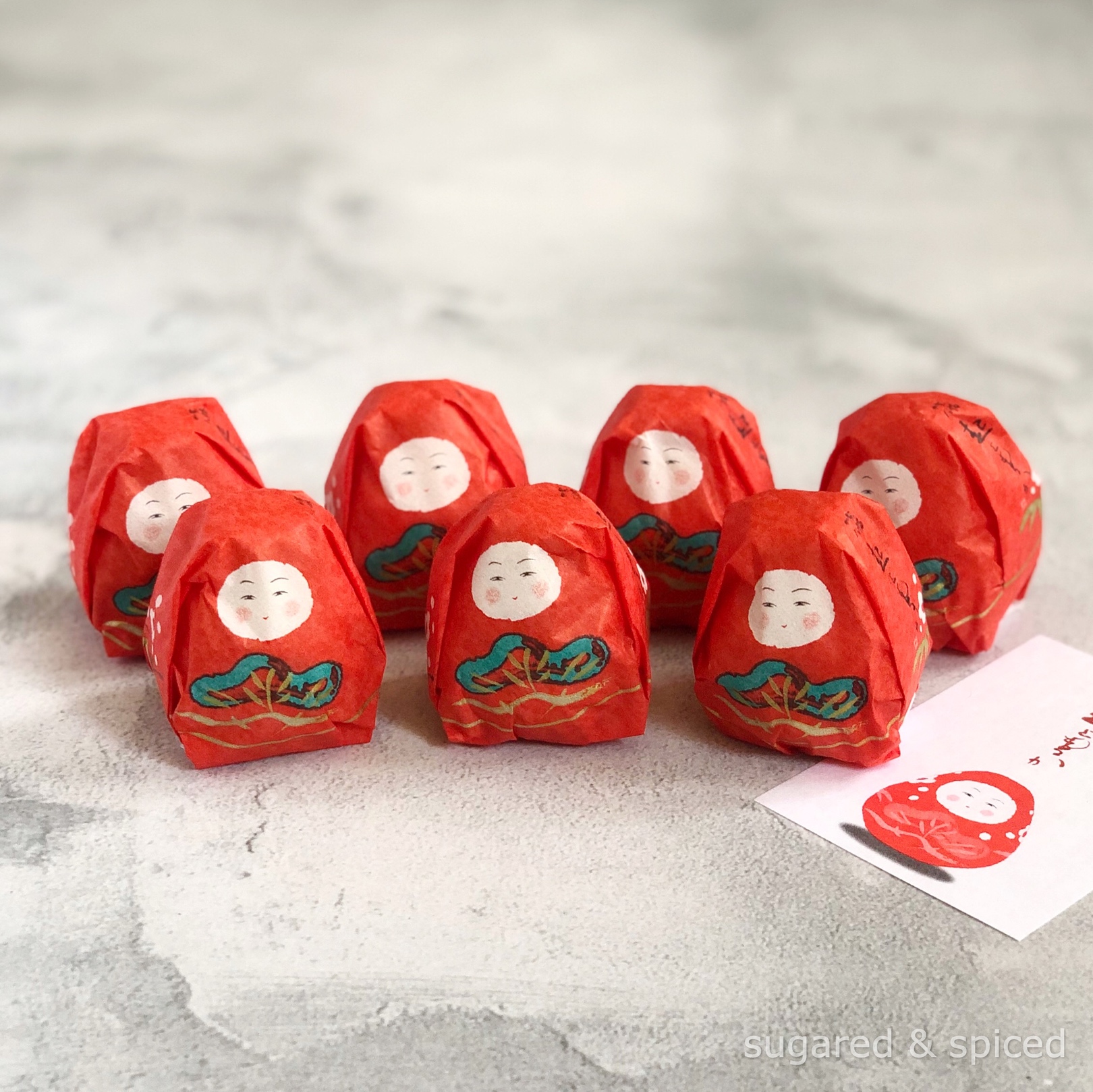 Modeled after the Kaga Hachiman okiagari*, these cute monaka cakes consist of a crisp outer crust made with rice, filled with sweet adzuki bean paste. Perfect with a cup of genmai tea.