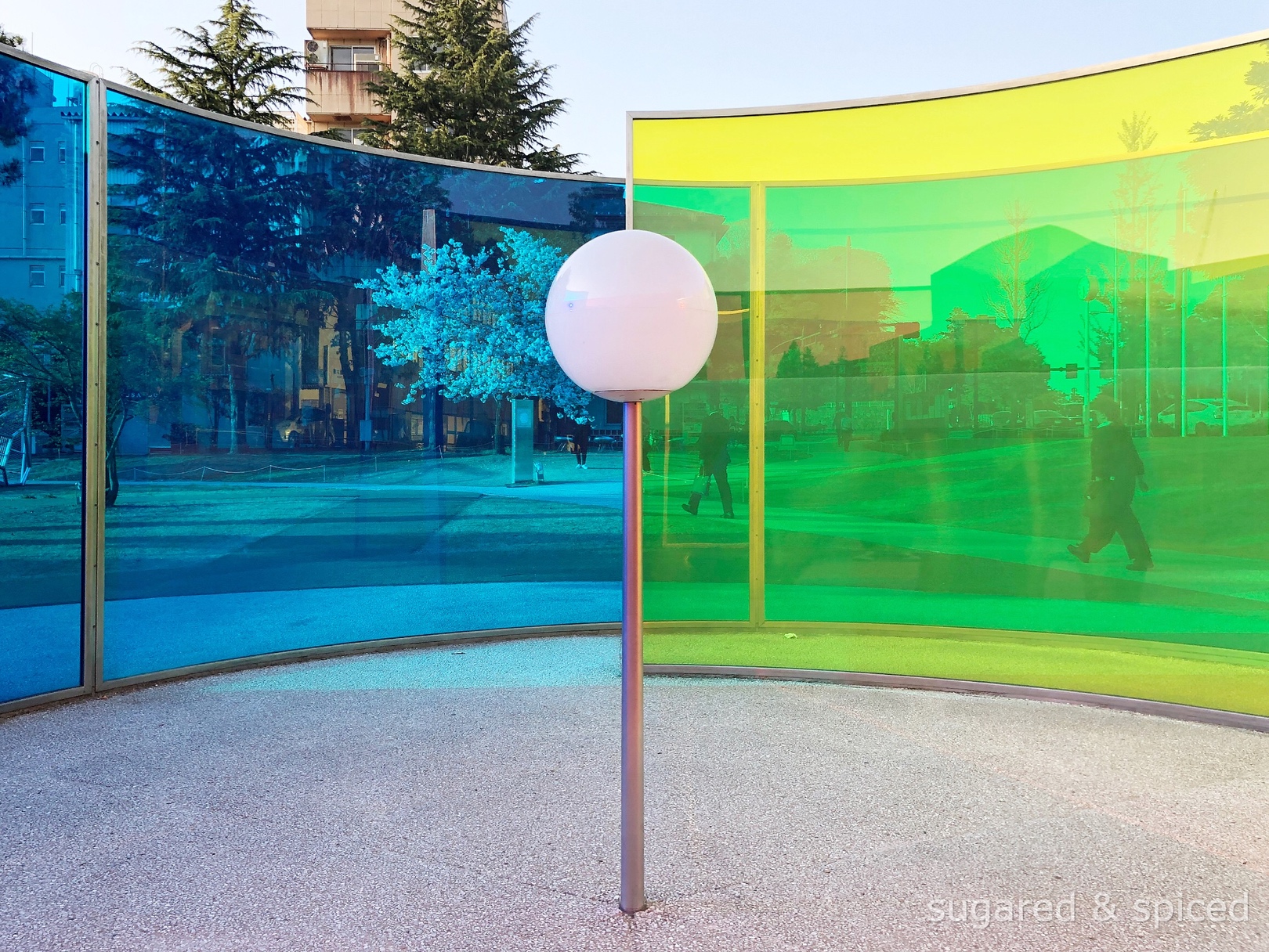 21世紀美術館室外和內部部分展區是免費的,不買票也可以看到知名藝術家的裝置作品,比如 Olafur Eliasson 的黃、綠、紅三原色玻璃幕牆,如同旋渦般,隨著日間光線的變化或者觀賞者自身的走動,都會有不同的斑斕景緻。