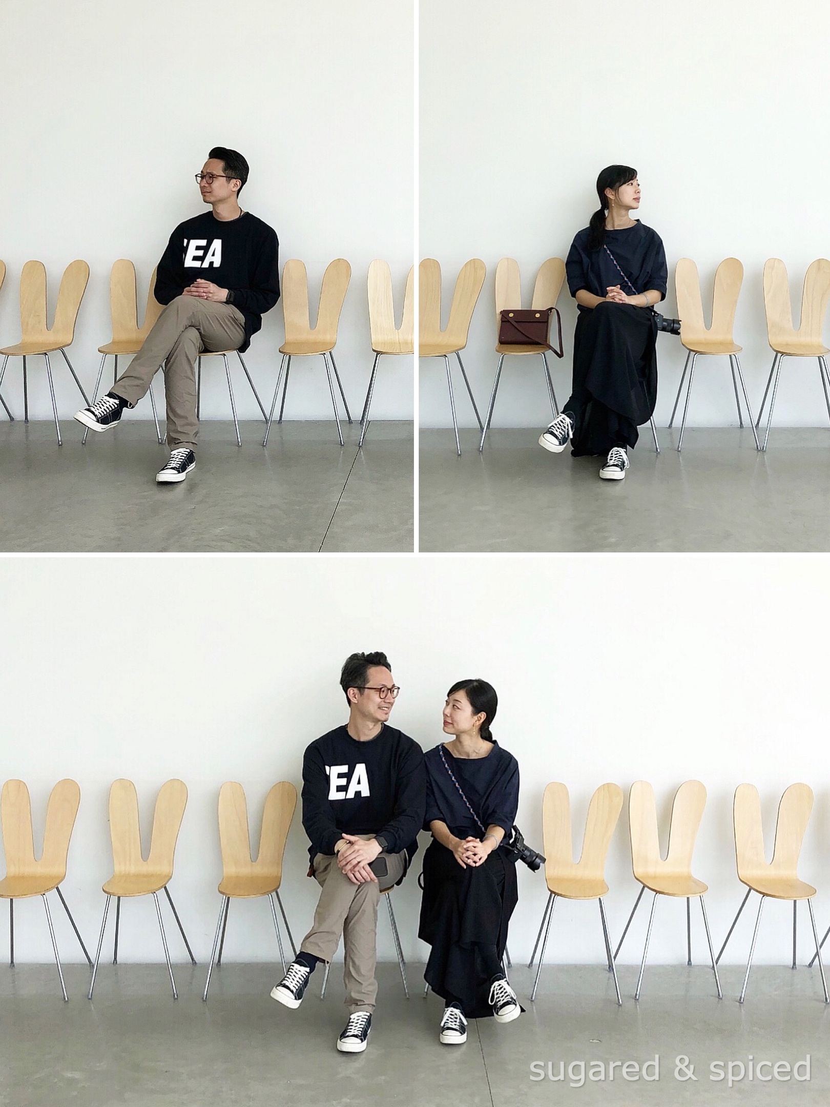 館內還有 SANAA 設計的 armless chair,可愛的造型像兔耳朵。心血來潮請路過的法國遊客幫我們拍了照,姿勢和表情都未經安排,沒想到效果出奇地好。這樣的路人,可以來一打!