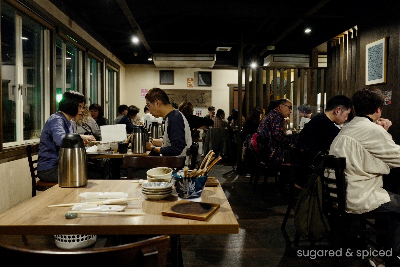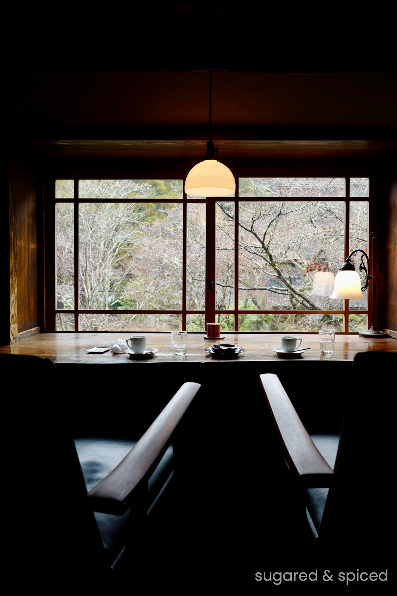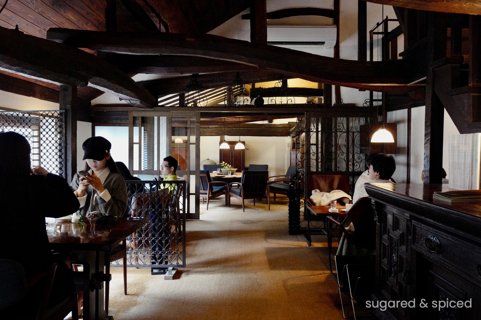 The interior of Sabo Tenjo Sajiki is dimly lit with a stylish vintage vibe. Every window and lamp seem to have their own stories…