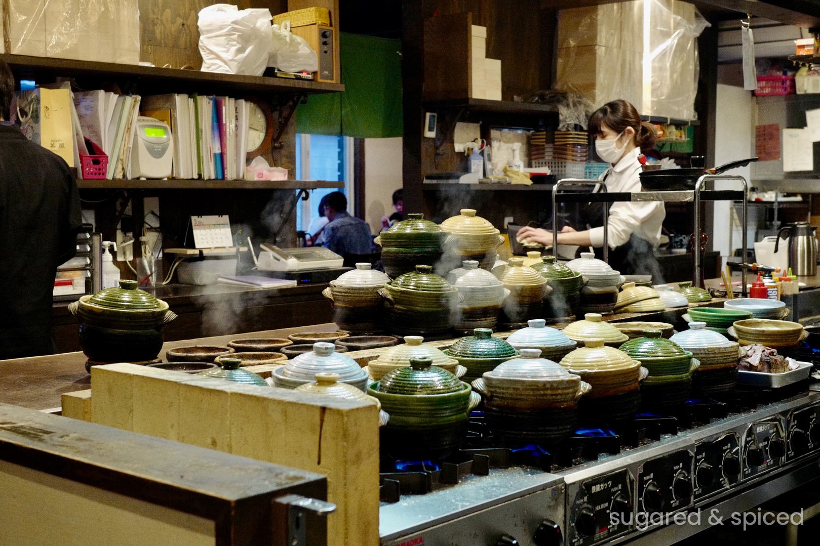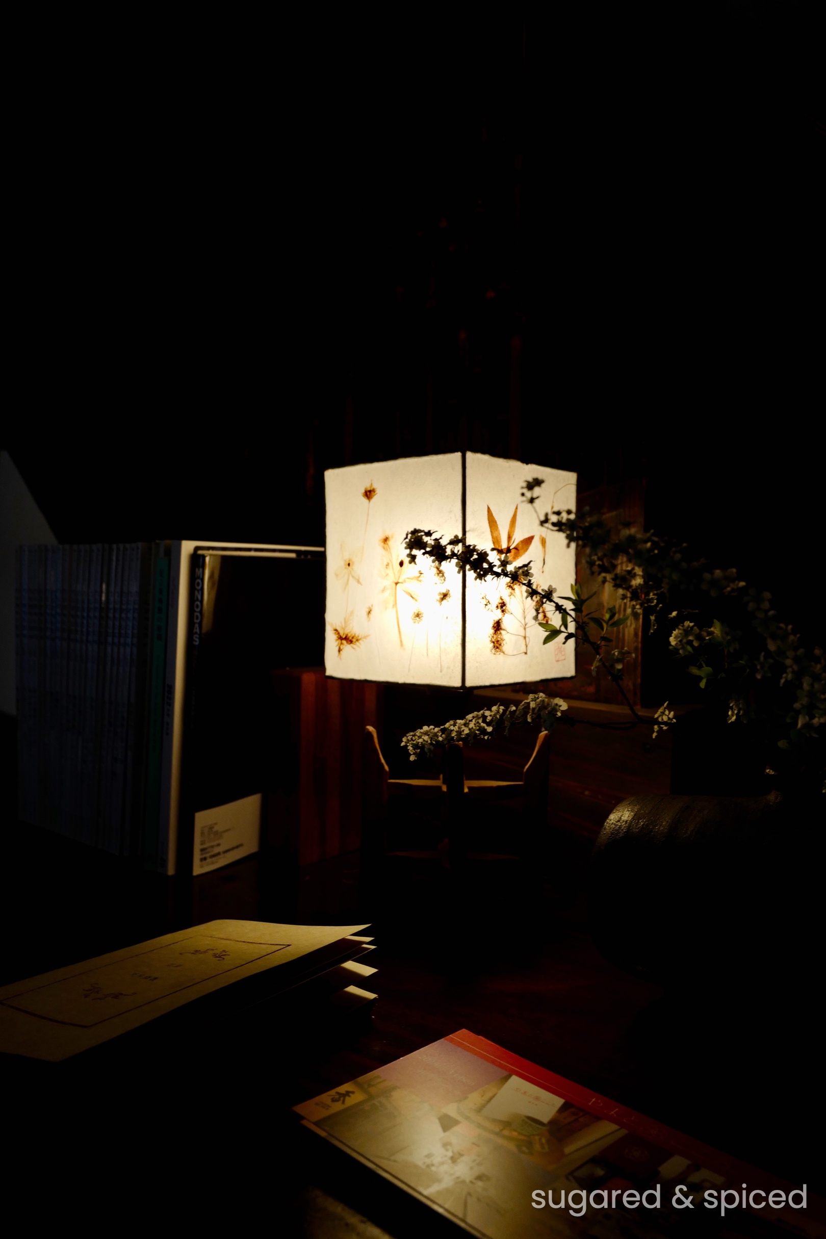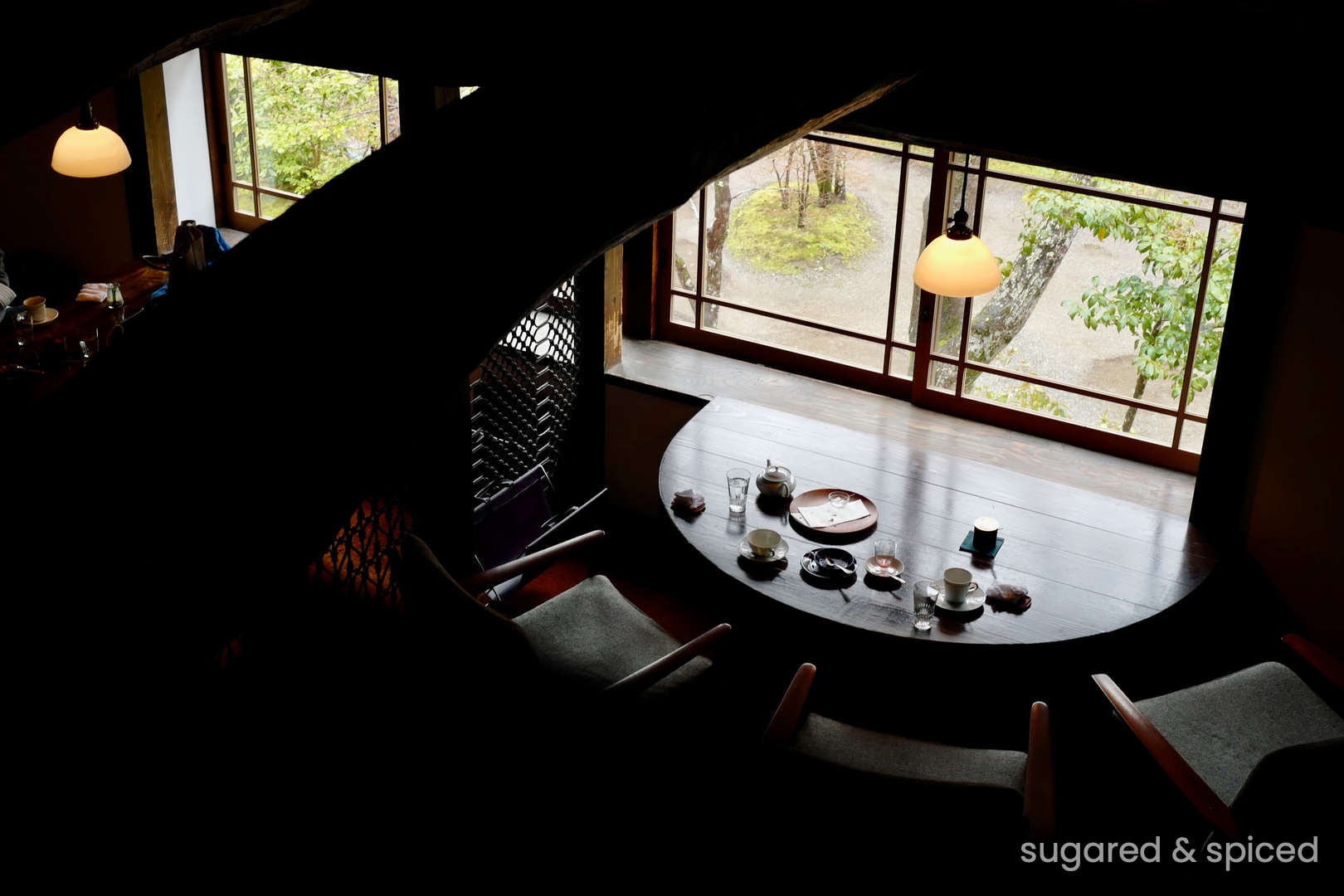 The interior of Sabo Tenjo Sajiki is dimly lit with a stylish vintage vibe. Every window and lamp seem to have their own stories…