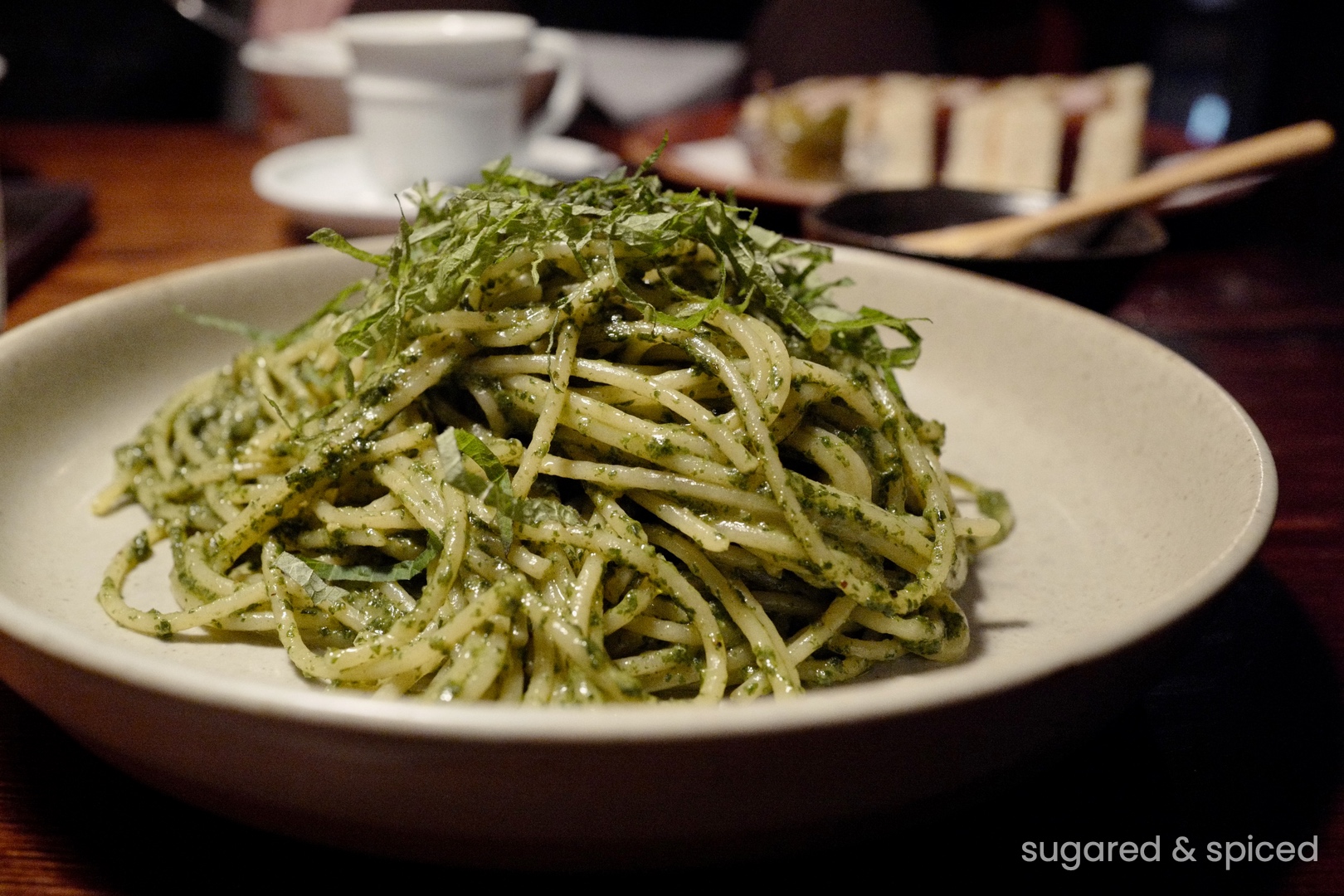The cafe is most popular for its coffee and house-made desserts, but since we haven’t had lunch yet, we started with the savories. Though the selection wasn’t huge, each dish we ordered was delicious, starting with this shiso pesto pasta.