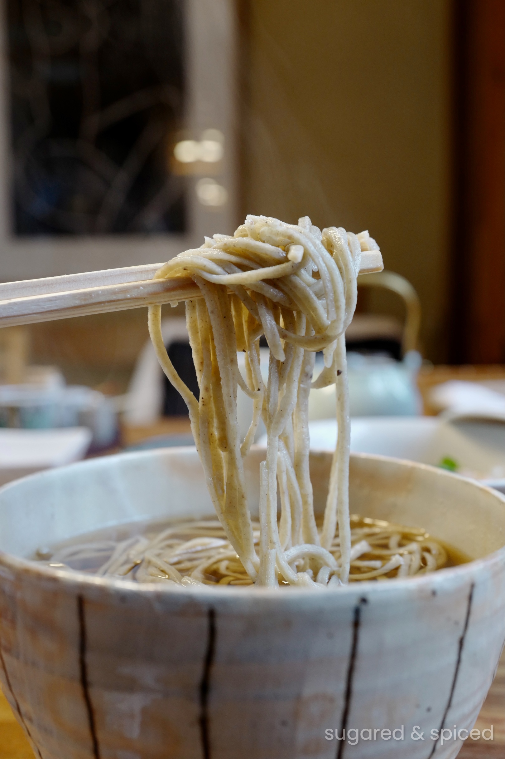 The specialty of the shop is black pork soba, with fatty pork belly braised so soft they disintegrate at the chopsticks, accompanied by fragrant soba noodles bathing in a soup base that’s flavorful without being too rich.
