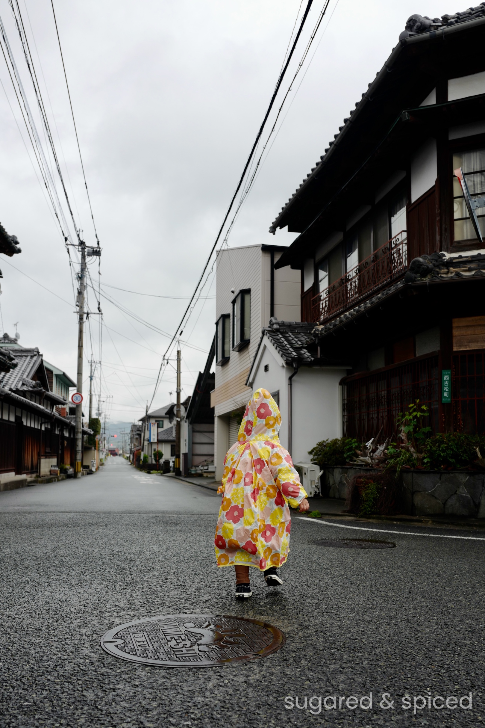 即使下雨也無妨,小Em愛極了穿著雨衣在古鎮裡到處閒逛。