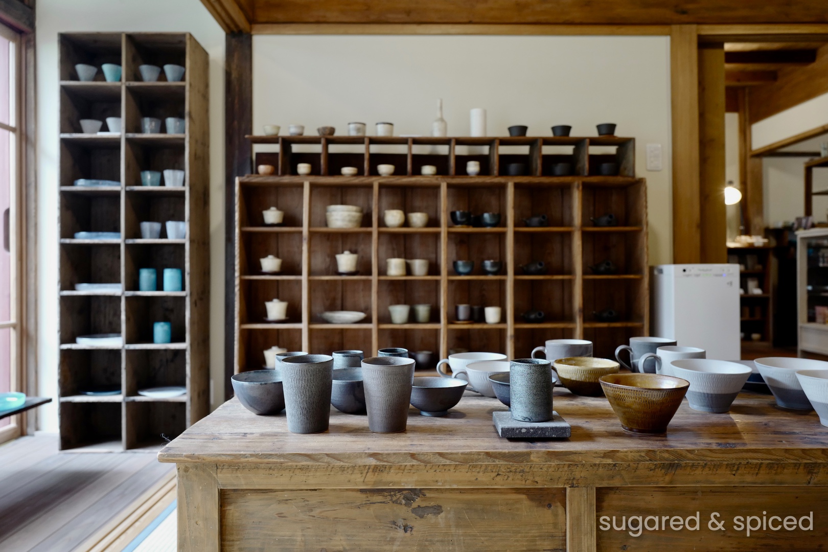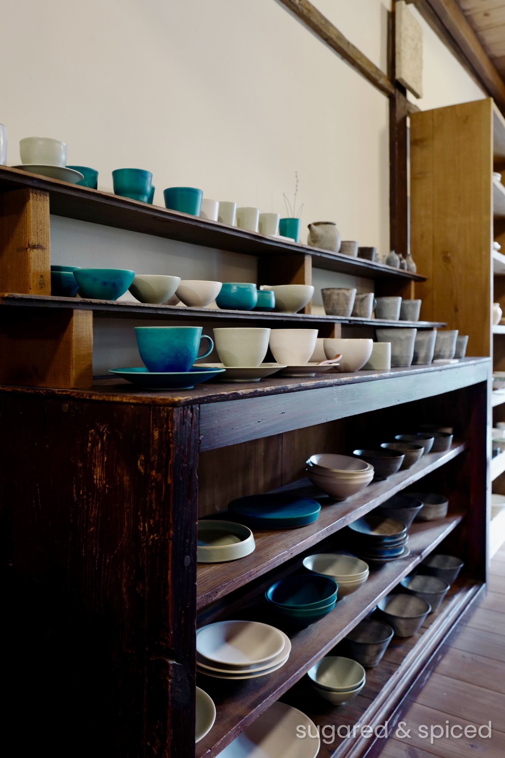 Okiya, tucked away in a corner near Yame’s Fukushima Hachimangu Shrine, is a stylish two-story building with a tableware shop “Neji” on the first floor, and a gallery / event space “okiya galerie” on the second floor. The product selection, which comes from all over Japan, is really beautiful – I went home with a heavy bag of bowls and plates and forks (all well-wrapped to withstand international travel). Incidentally, the owner also runs a tea shop called “AO Cafe” close by, if you are looking for somewhere to rest your feet.
