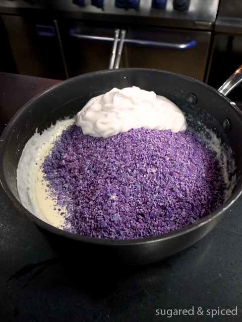 Let’s start cooking. First, shave cauliflower florets with a potato-peeler and cook the trimmings in boiling salted water. Look at that beautiful purple color! You can also use white cauliflower, but it obviously won’t have the same visual impact.