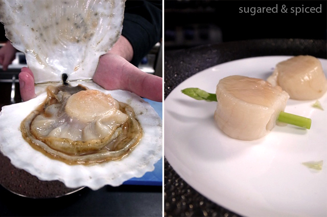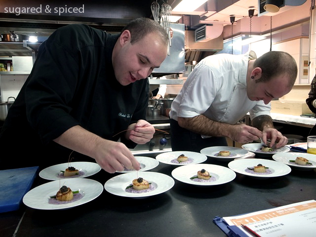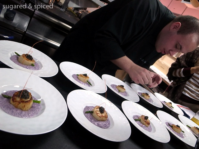 After downing a few buttery croissants and cups of hot coffee, the students – around 10 of us – gathered in the kitchen for the cooking demo. I knew we were in for a real treat when I saw the ingredients on the table – caviar, black truffle, lobsters, scallops, foie gras…oh my. The first dish Mickael demonstrated was Seared Scallops with Caviar, Asparagus, and Purple Cauliflower “Risotto”. I have included the basic instructions here, but if you want the full recipes, leave me a comment or email me at sugarednspiced@gmail.com and I will be happy to send you the files.