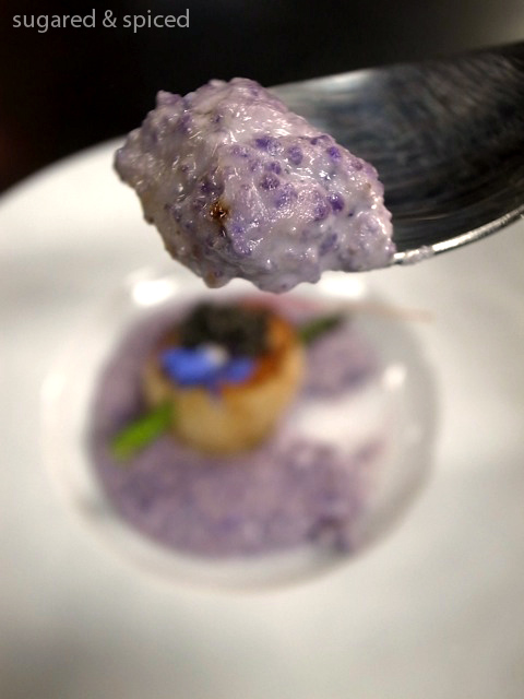 Seared scallops with caviar, asparagus, and purple cauliflower “risotto”
