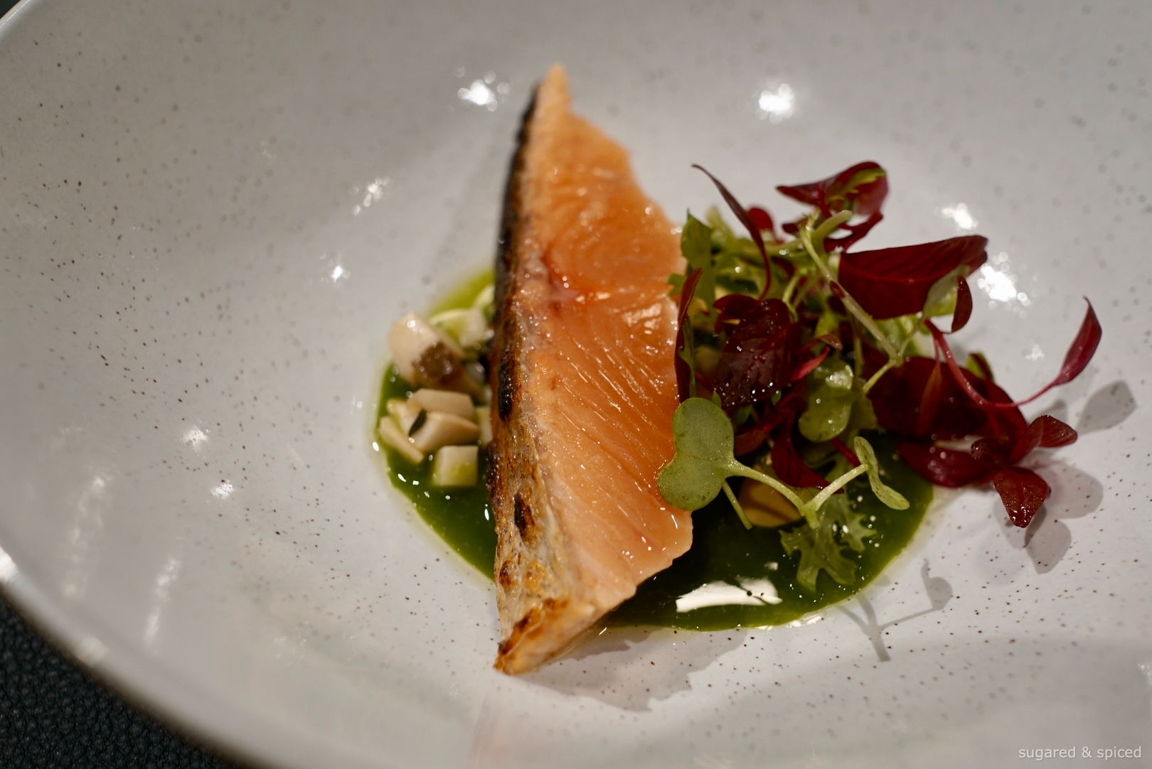 Sakura-masu, or cherry salmon, was brined and slightly torched so that underneath its crispy skin, the beautiful orange-pink flesh remained barely cooked and exceedingly tender. Plated with pistachio sauce, squid ink sauce, stir-fried mushrooms for texture, baby leaves of various herbs, and a drizzle of hazelnut oil. Served lukewarm on purpose, mild like spring itself.