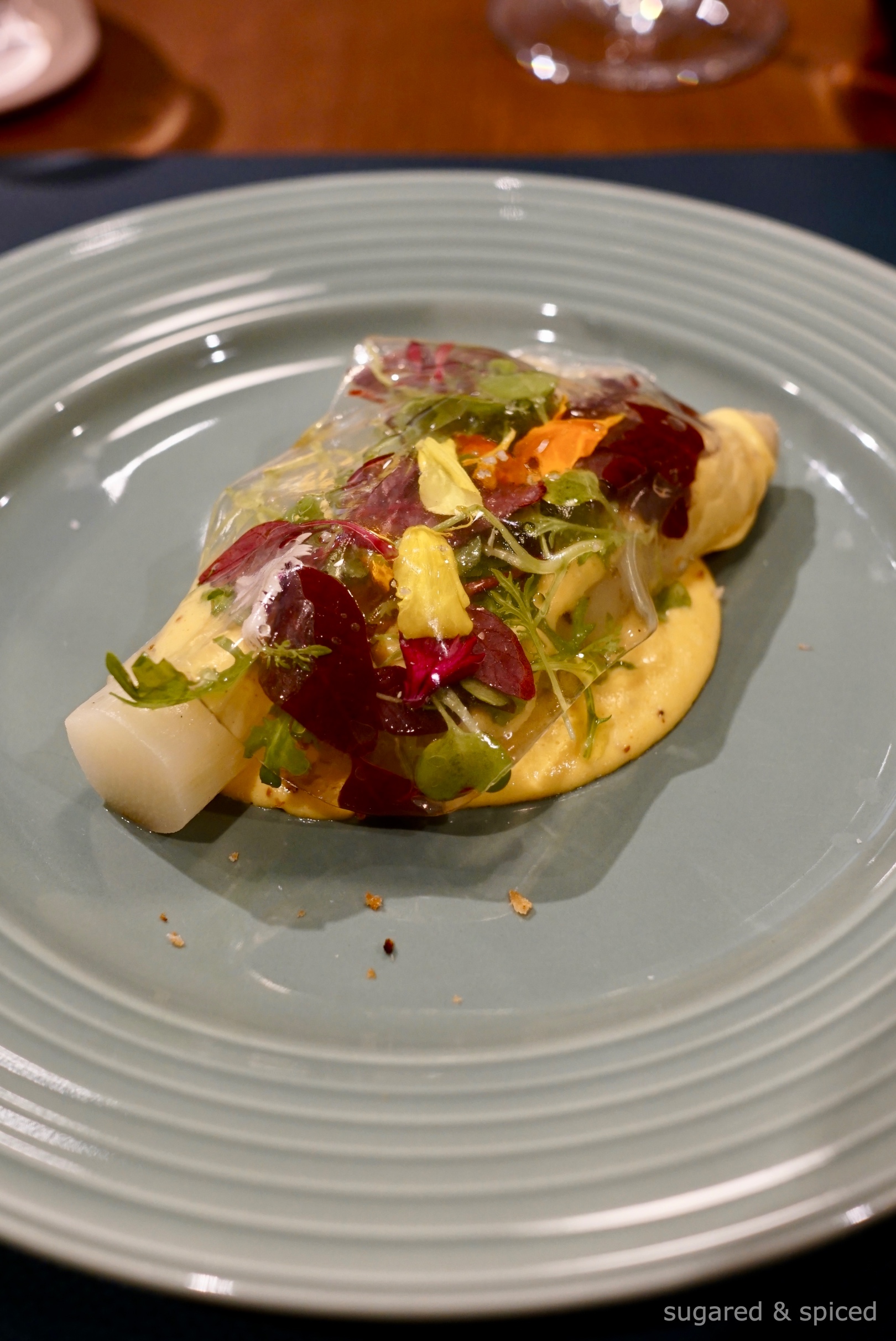 White asparagus, plump and dripping with flavor, on a puddle of sabayon made from white asparagus puree and passito sweet wine. Blanketed in spiced bread crumbs, fresh leaves, edible flowers, and a jelly made of clarified white asparagus and ham consommé, so delicate it seemed held together by little more than a wish.