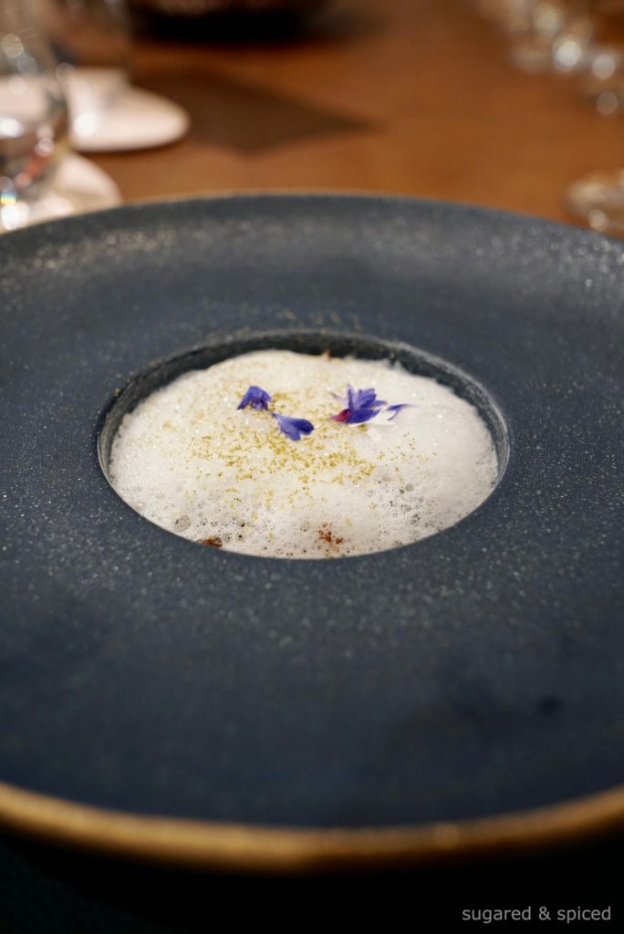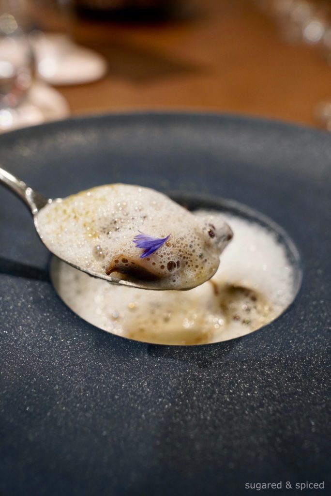 A duo of white jade snail and firefly squid in a warm, thick sauce of scallions (using only the white, sweeter part), potato, and rabbit stock. Juniper berries and bay leaves-infused milk foam, a sprinkle of bay leaf powder and cornflower petals – a small detail that conjured up images of springtime in Italy.