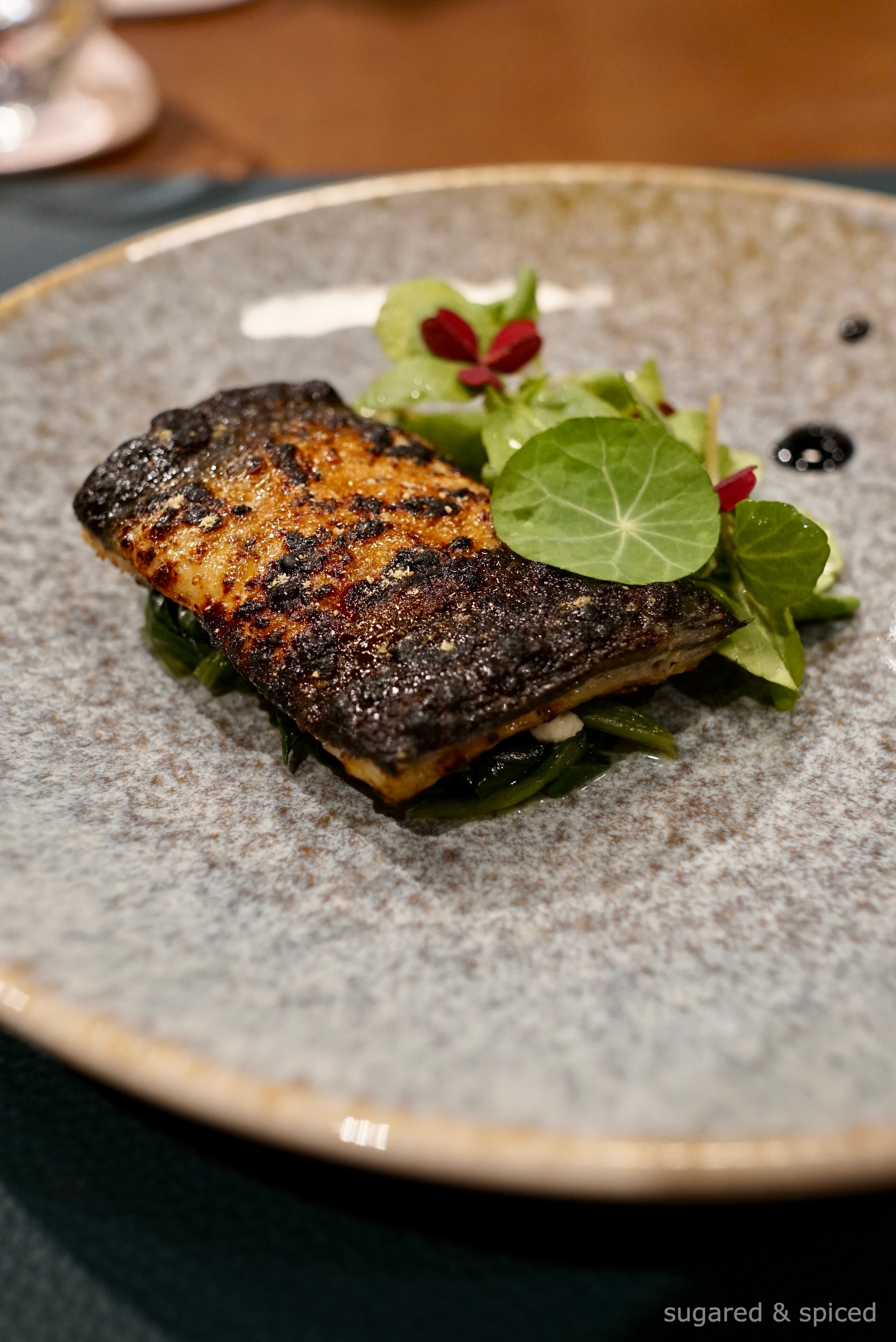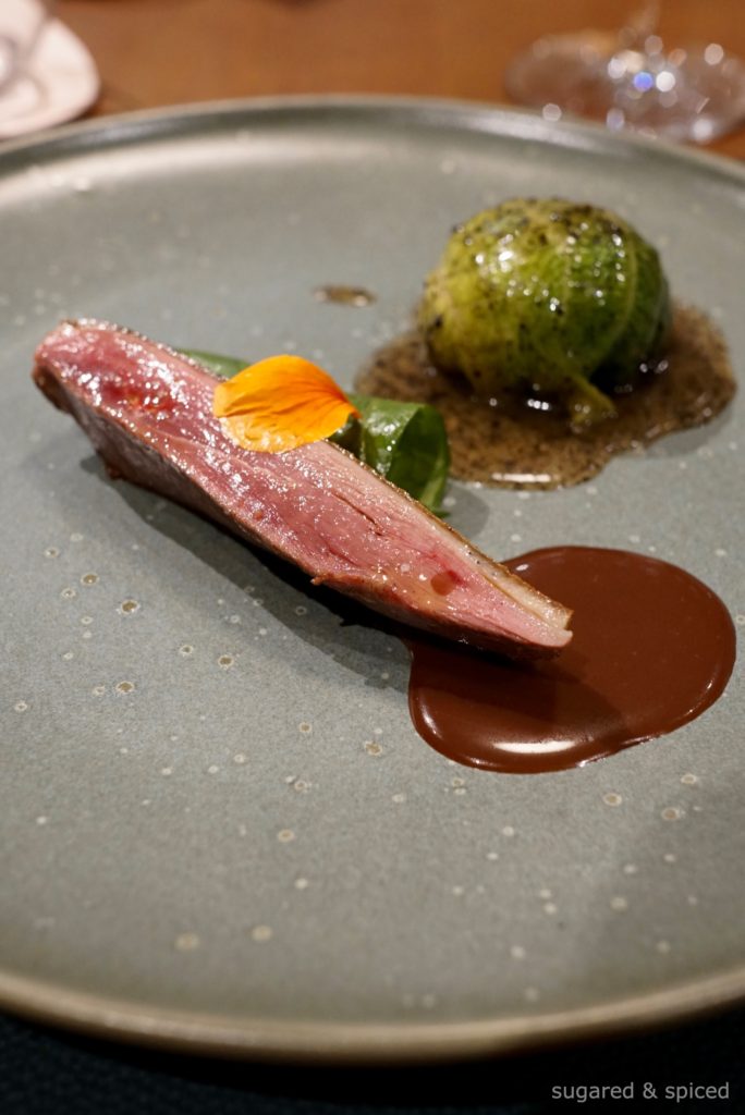 A beautiful sliver of mallard. Brined, seared, drizzled with hot oil, roasted, smoked, rested…a prolonged cooking process to retain moisture in the meat. Served with marinated wasabi leaves and an acidic port wine sauce to bring out the sweetness of the duck.
