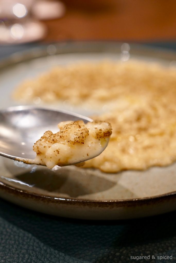 It turned out that Oscar had clarified the tomato soup (made from four tomato varieties) to remove all traces of red, retaining only its flavor to cook Acquerello rice with. He then added butter, pecorino cheese, and mascarpone to create emulsification, before drizzling Barbera Lorenzo #3 olive oil and powdered capers for yet another layer of acidity. Each grain of rice had soaked up the intense and the mellow, each bite left me eager for the next. An extraordinary risotto.
