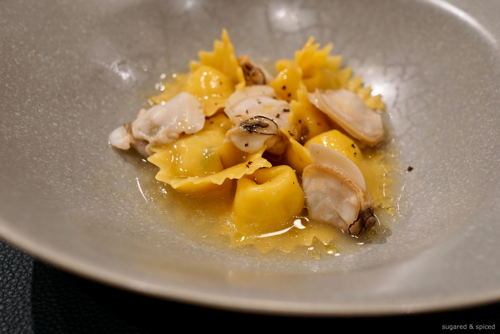 Handmade tortelli stuffed with clams and salted cod, the latter of which had been whipped to an airy, fluffy texture. The pasta dough was made with a mix of 00 flour (a finely ground Italian flour) and duro (durum/semolina wheat) flour, hence the yellowish hue and more granular texture. The sauce, clam and chicken stock emulsified with olive oil, was particularly luscious, I would’ve loved a small cup of this to sip and savor on the side.