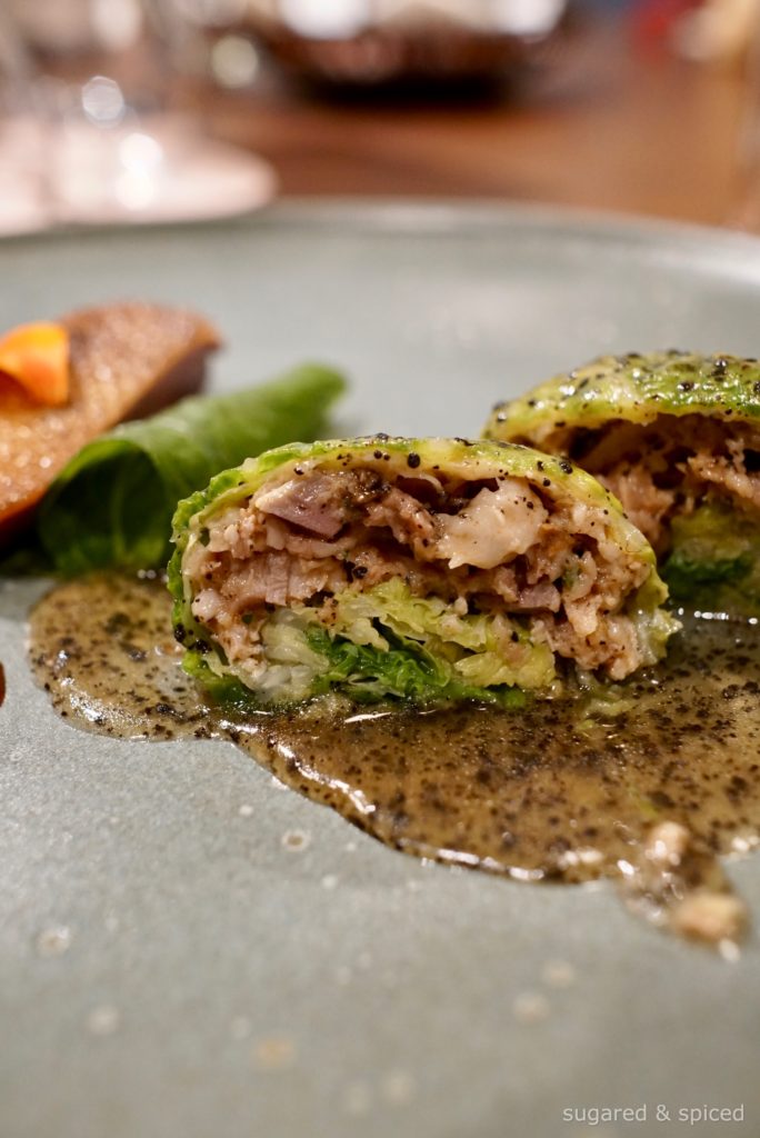 On its side, savoy cabbage wrapping a confit of mallard leg and innards, minced chicken and mushrooms, drizzled with a complex sauce of mallard stock, porcini, morels, Darjeeling, and black truffle, resulting in a rounded, 3-dimensional flavor that seemed to take on a voluminous shape on the palate.