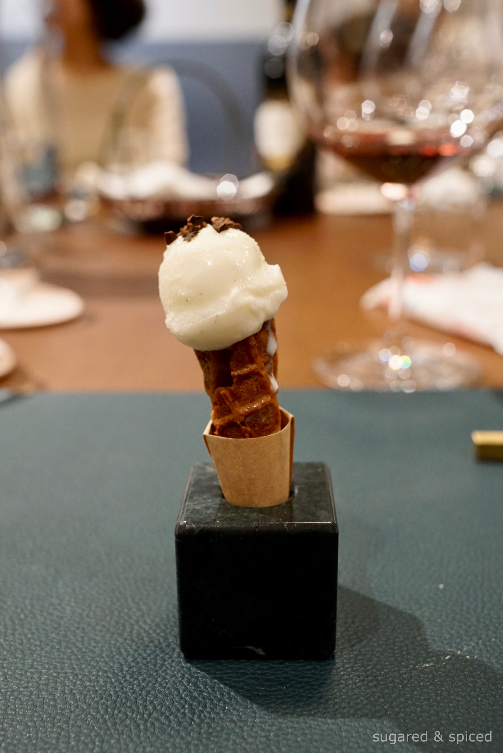 Milk (from Tokachi, Hokkaido) and vanilla gelato. The mini cone, made with brown sugar instead of white, had a darker color, extra crisp texture, and alluring aroma. A delightful bite.