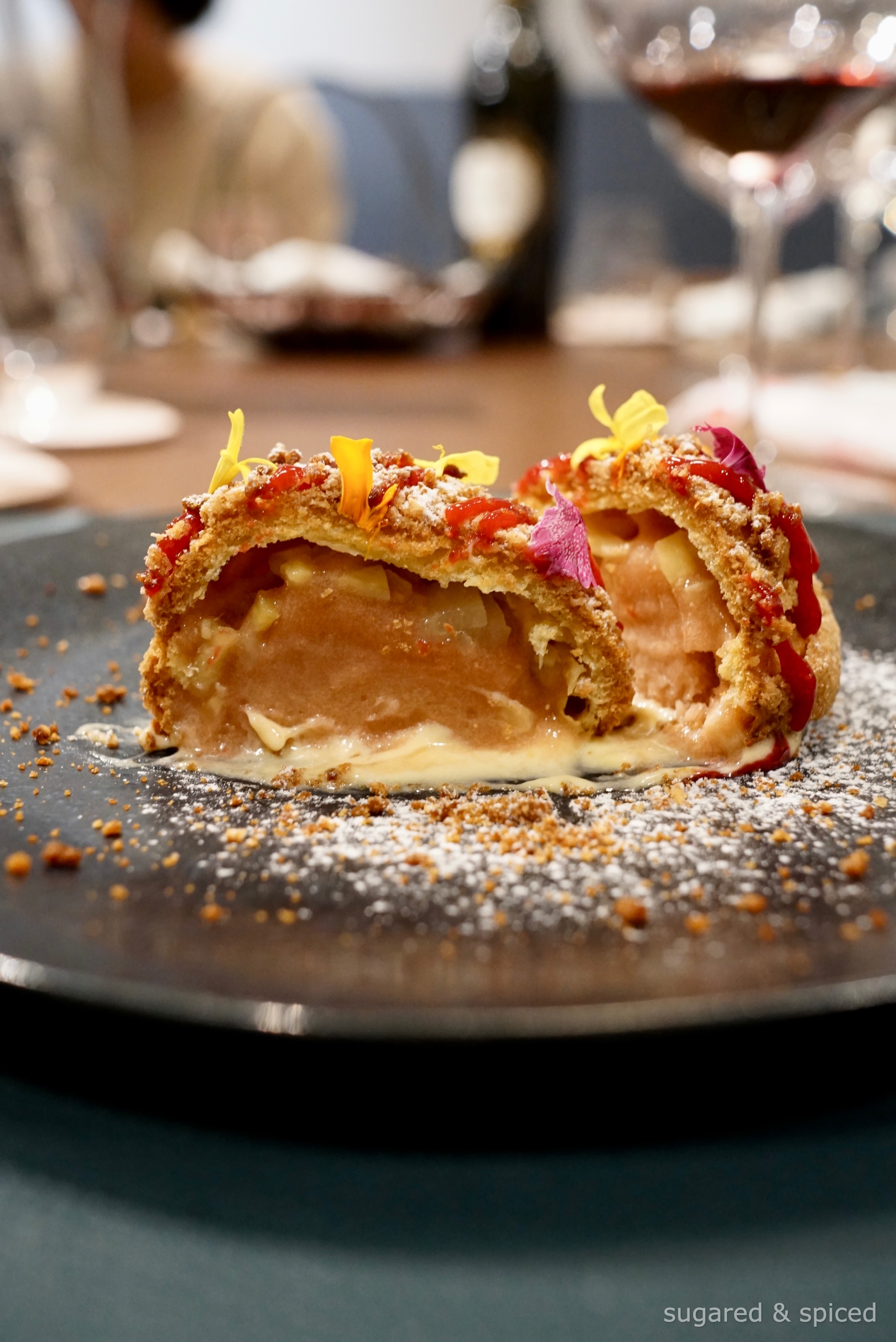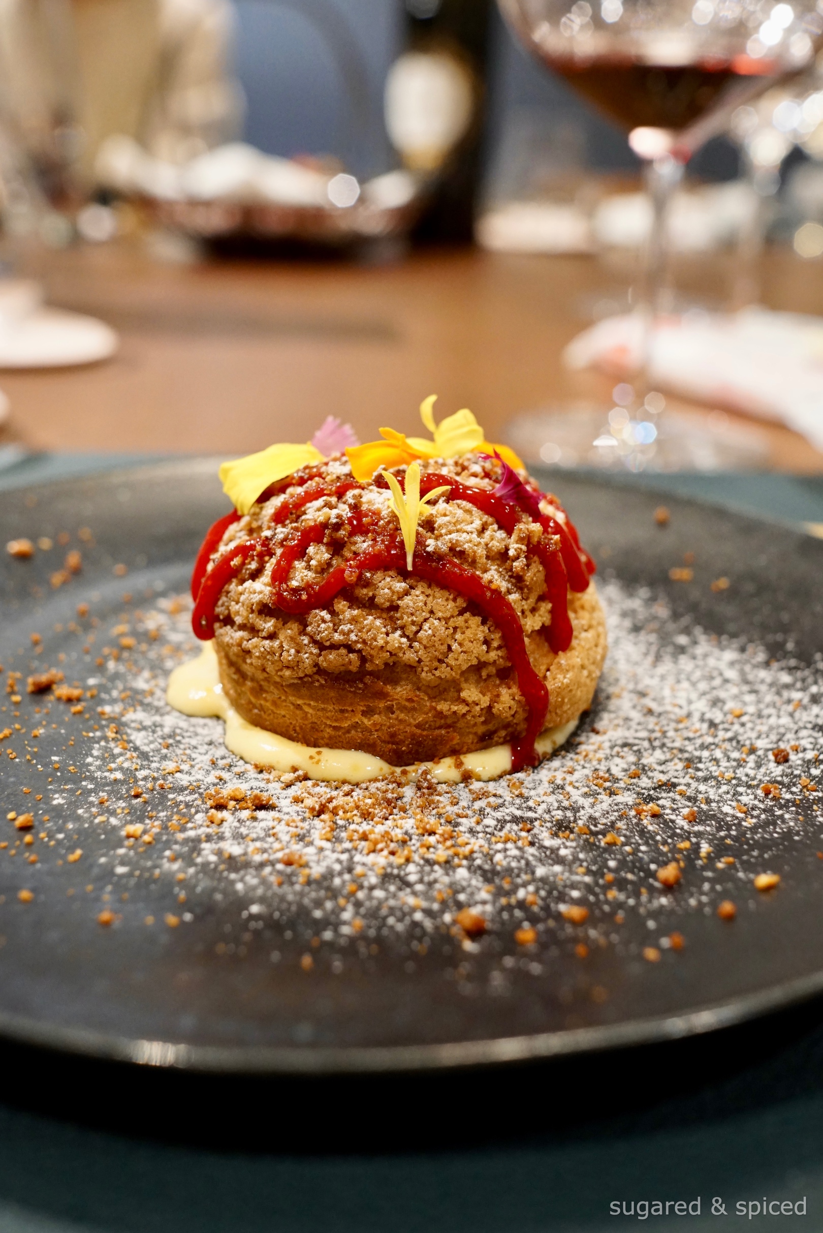 Cream puff filled with vanilla semifreddo, rhubarb ice-cream, candied ginger, candied pear, drizzled with a syrup of raspberry, blood orange, elderflower, and spiced ginger crisp on top.